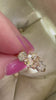 A stunning peachy, champagne Old European Cut diamond is flanked by two smaller stones, contrasting beautifully in this low-profile, finger-wrapping dream. We love how the two-tone setting enhances the contrast of the unique hue of the center stone against the bright white side stones.