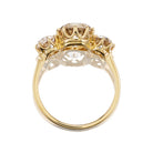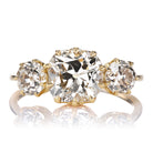 This beautiful chunky old mine cut has the most lovely, warm undertones, making this diamond a champagne lover's dream. Our beloved three-stone setting is the perfect finger-spanning style for those who want *all* the finger coverage.