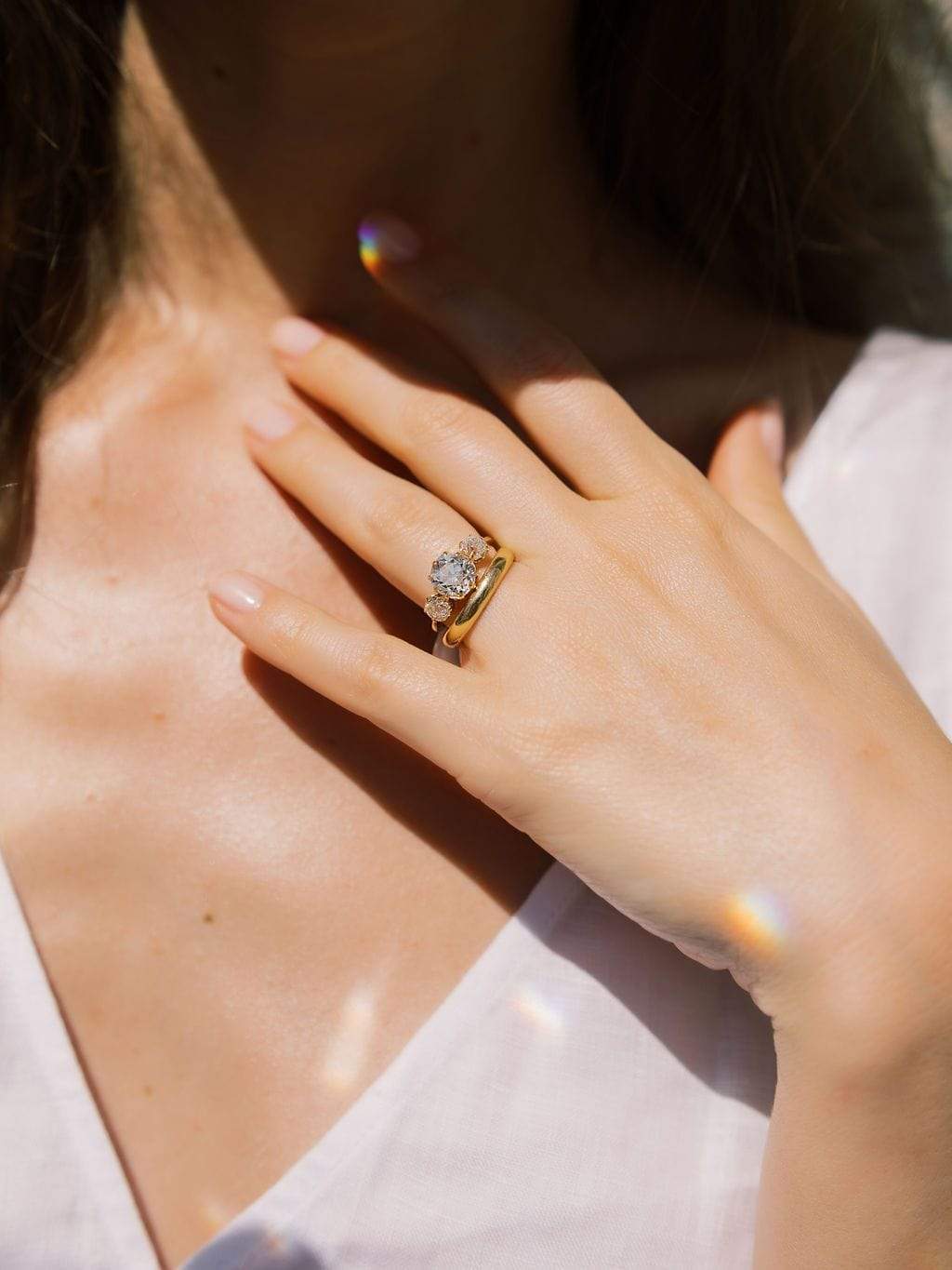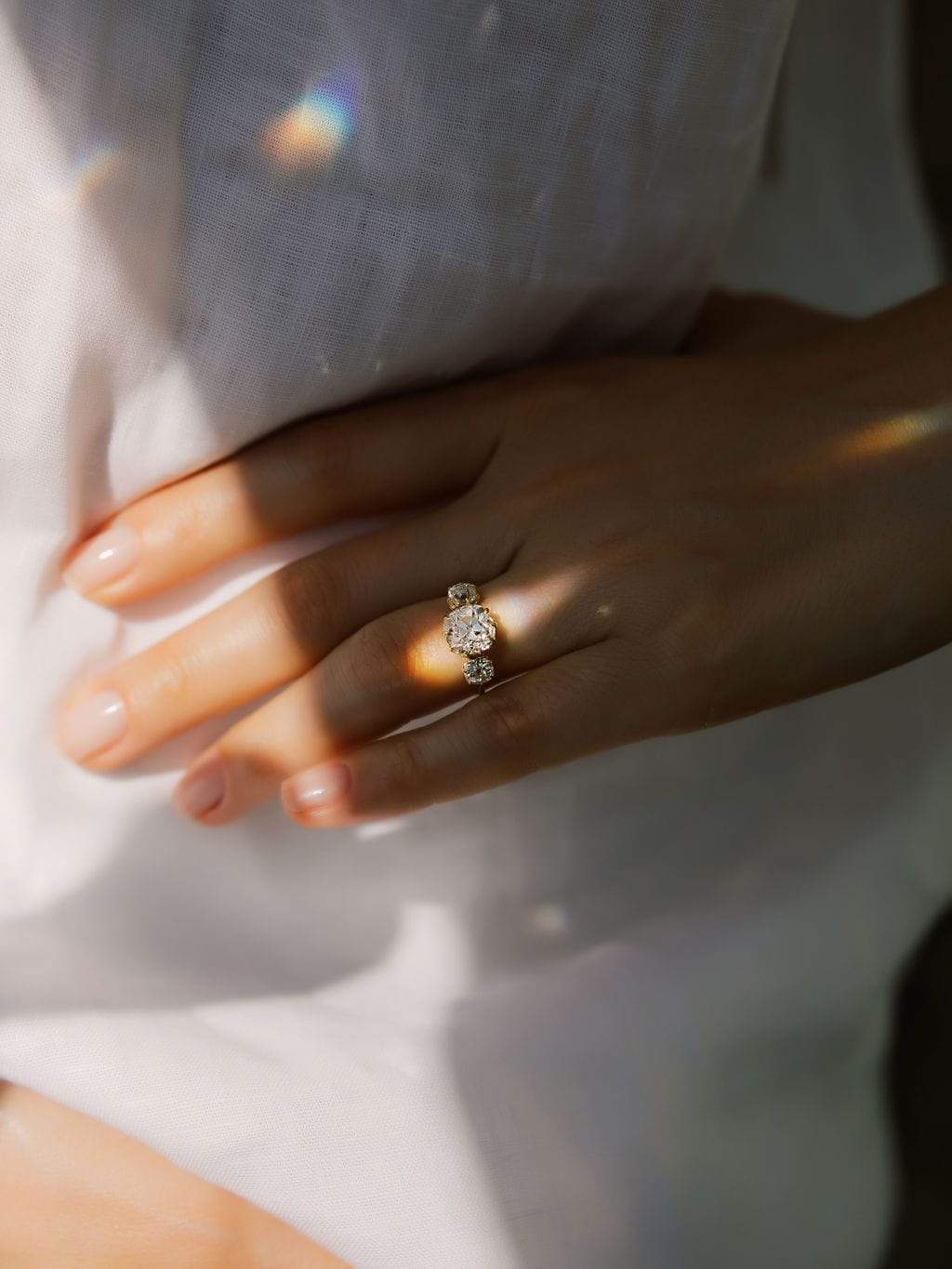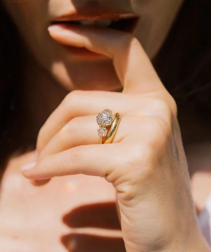 This chunky old mine cut diamond is quite beautiful and perfectly complemented by equally chunky old mine cut diamonds to each side. The delicate setting creates a lovely combination between bold and dainty with a spread that covers the finger!