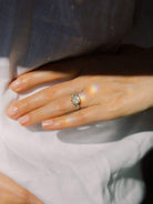 The Marielle 2.28 ring is a vintage-inspired VB-made diamond engagement ring. The ring centers a GIA certified 2.28 carat old mine cut diamond of K color, SI1 clarity. The center stone is set in a 10-prong 18kt yellow gold setting with an old mine cut diamond set to each side of approximately K-L color, VS clarity that combine for 0.93 carats. The ring is currently size 6.25 and can be resized!