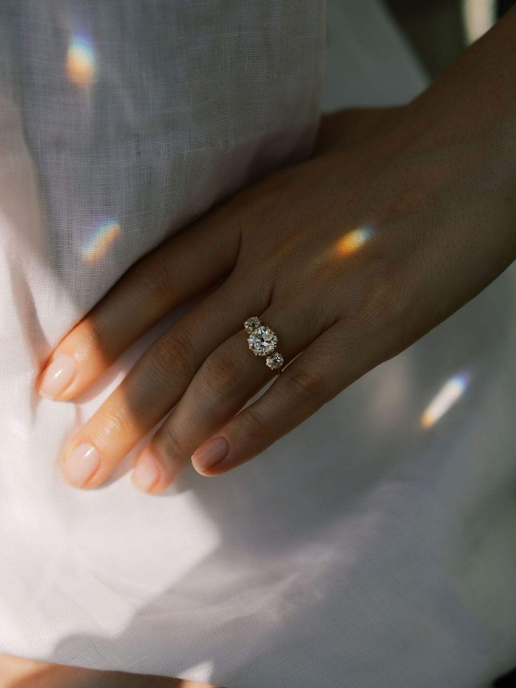 Three Stone Old Mine Cut Diamond Engagement Ring in Yellow Gold