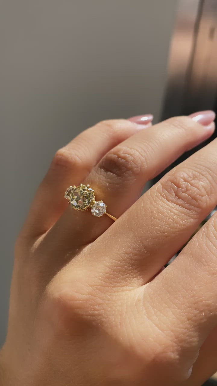 The Marielle 2.18 ring is a VB original design made right here in NYC using authentically antique diamonds. The ring centers a GIA certified 2.18-carat old mine cut diamond of Y-Z color, VS2 clarity. To each side of the stone is an old mine cut diamond of approximately I-J color, VS clarity both combining for approximately 0.70 carats. The stones are all set in an 18 karat yellow gold setting. The ring is currently size 6.5 and can be resized!
