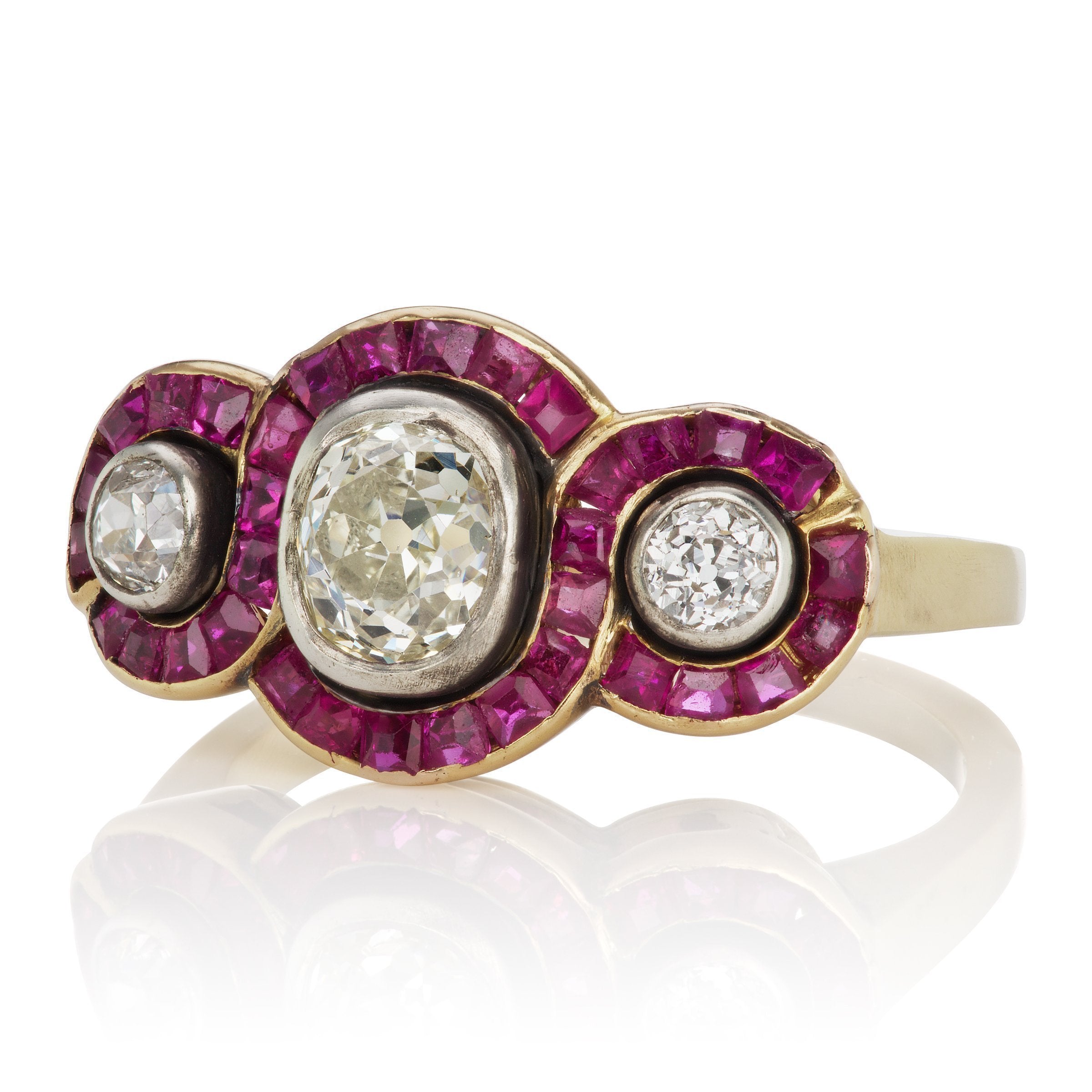 The Candy Ring is an Edwardian Era Vintage Engagement ring circa 1915. This three stone oval halo engagement ring centers an old mine cut diamond of approximately 0.90 carats, L-M color, SI1 clarity. To each side is an old European cut diamond, each approximately 0.25 carats, I-J color. The three diamonds are bezel-set in silver and are surrounded by woven calibre cut rubies that are set in 14kt yellow gold. The ring is currently size 6.25 and can be resized!