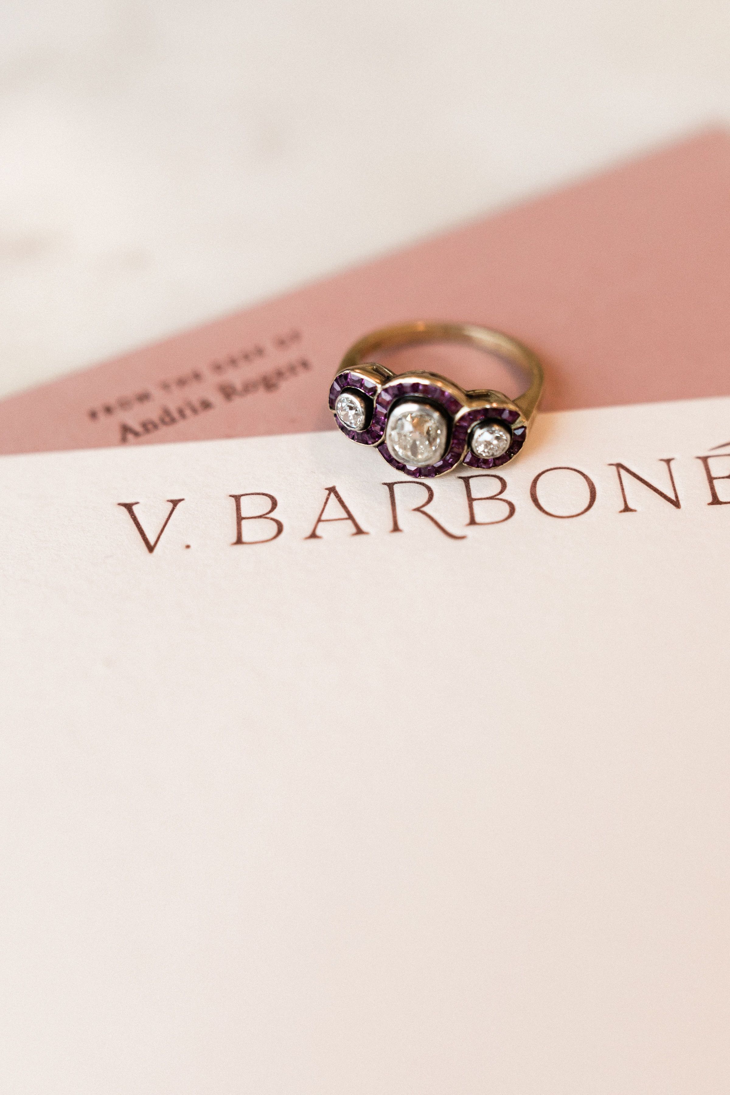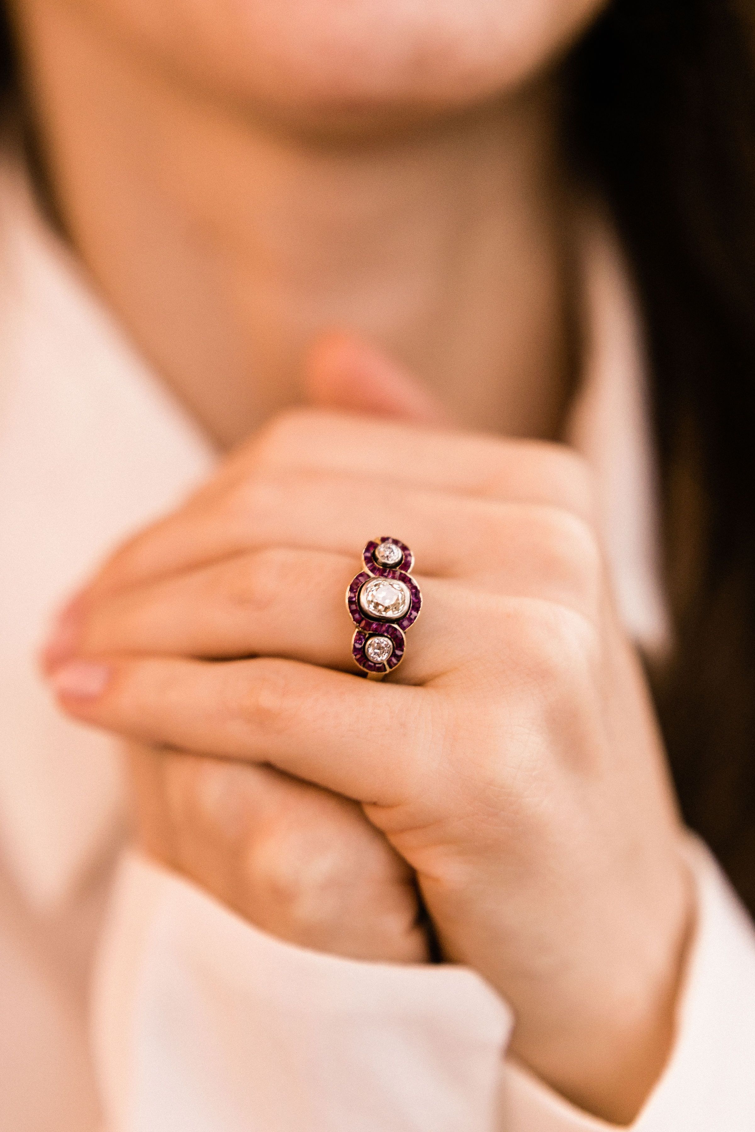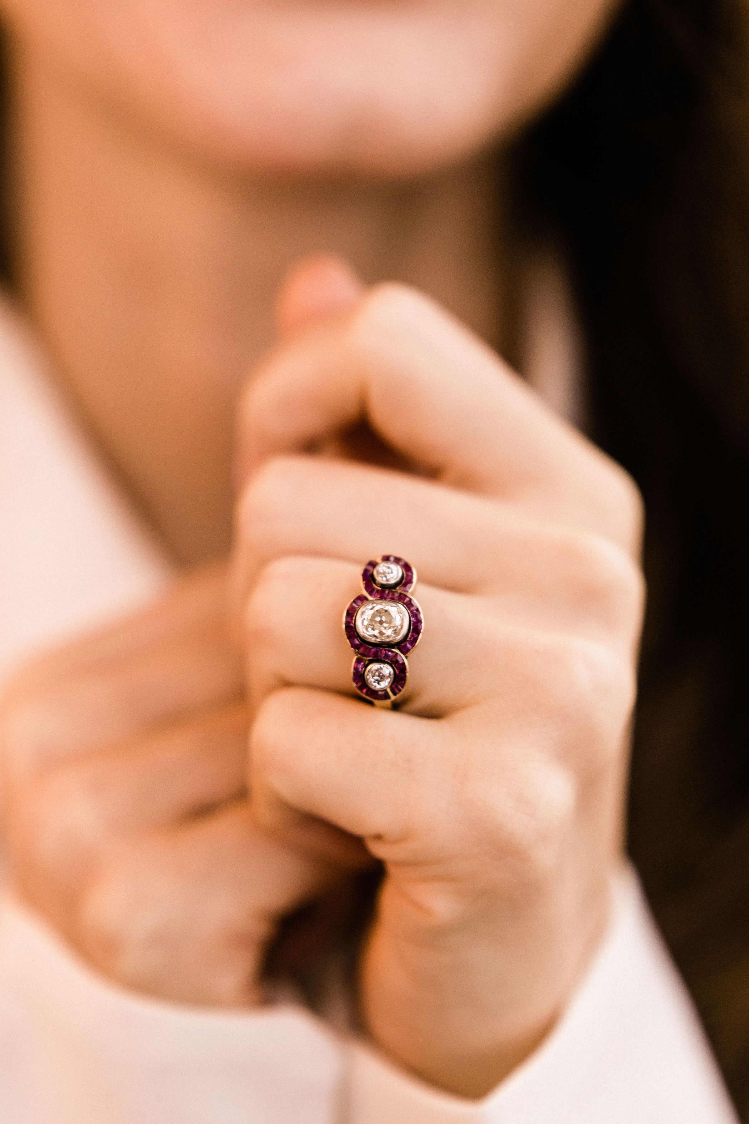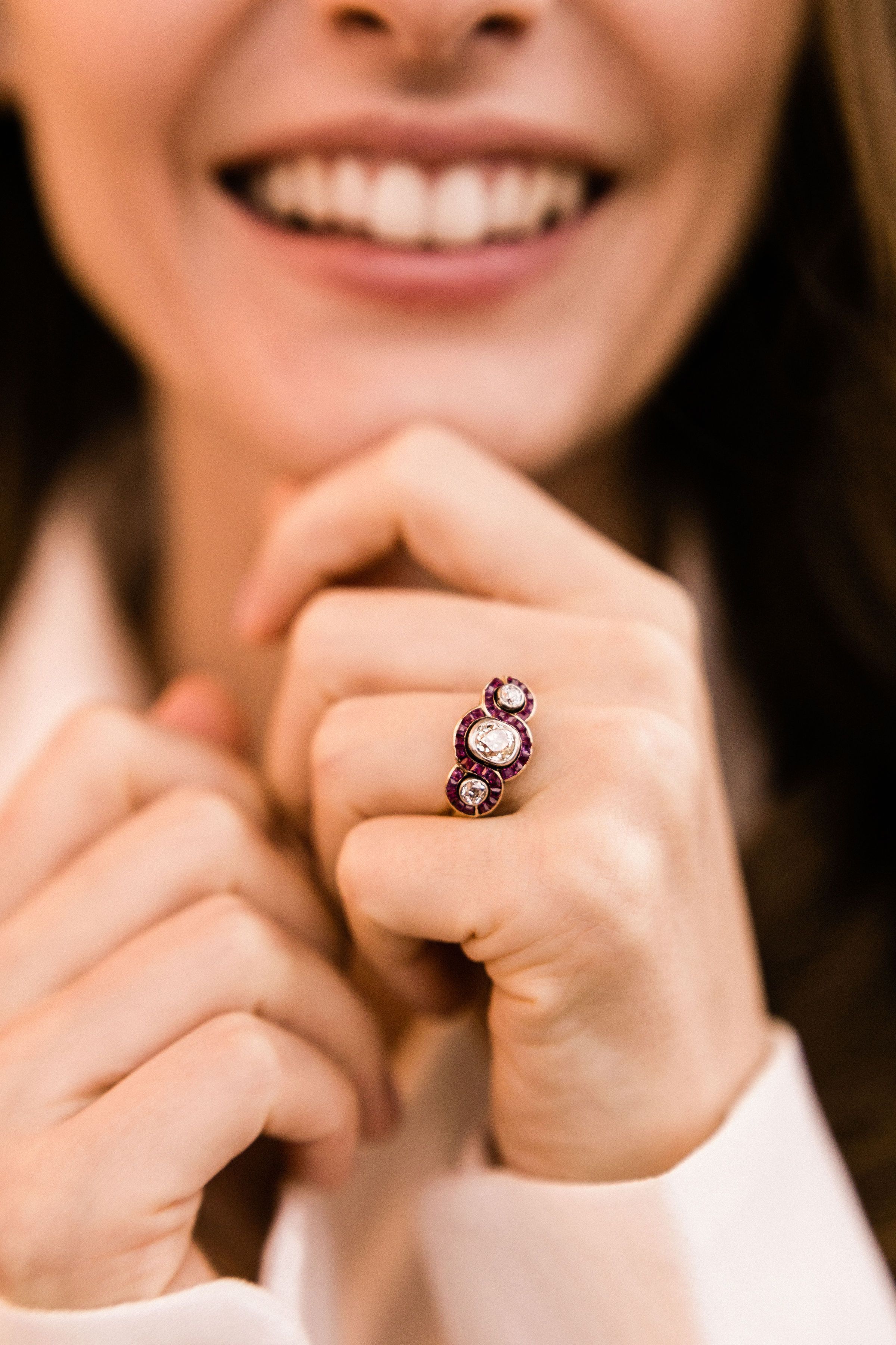 An authentic piece with so much character! The diamonds are gorgeous old cuts and they pop beautifully against the beautiful rubies! Super low profile with a big look!