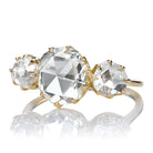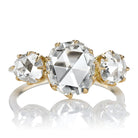 The Marielle 1.71 ring is an AB original design made right here in NYC. The ring centers a GIA-certified 1.71-carat Rose Cut diamond of J color, SI2 clarity. On either side of the center stone is a Rose Cut diamond of approximately J color, SI-I1 clarity, totaling 0.71 carats. The stones are set in an 18kt yellow gold setting. The ring is currently size 5.25 and can be resized!