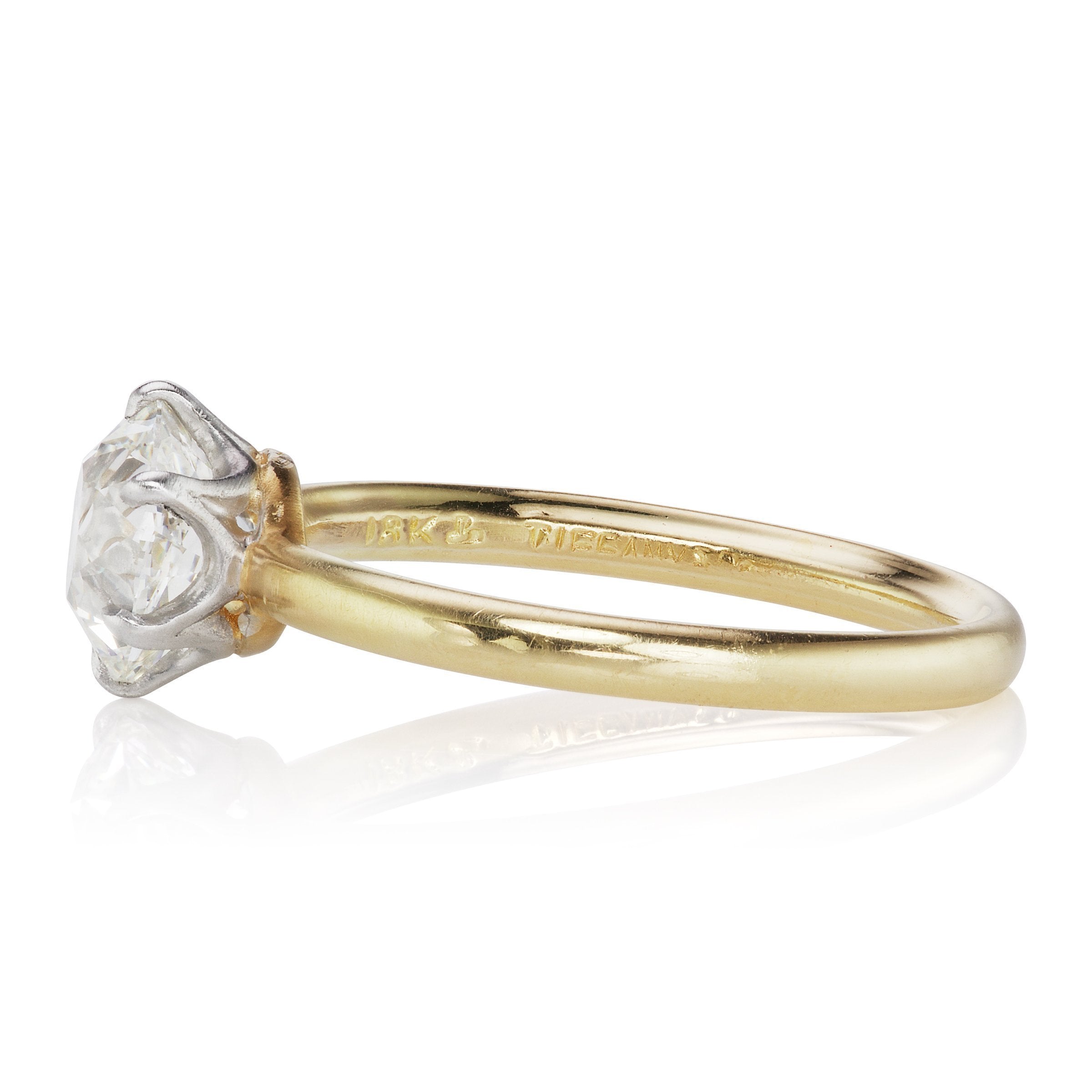 The Cassie Ring is an authentic Tiffany & Co Edwardian engagement ring circa 1910. This Tiffany 6 prong engagement ring centers a GIA Certified 1.52ct Old European Cut diamond of J color, VVS2 clarity. The diamond is set in a sleek 6-prong platinum basket with an 18kt yellow gold shank. The ring is size 6 and can be resized!