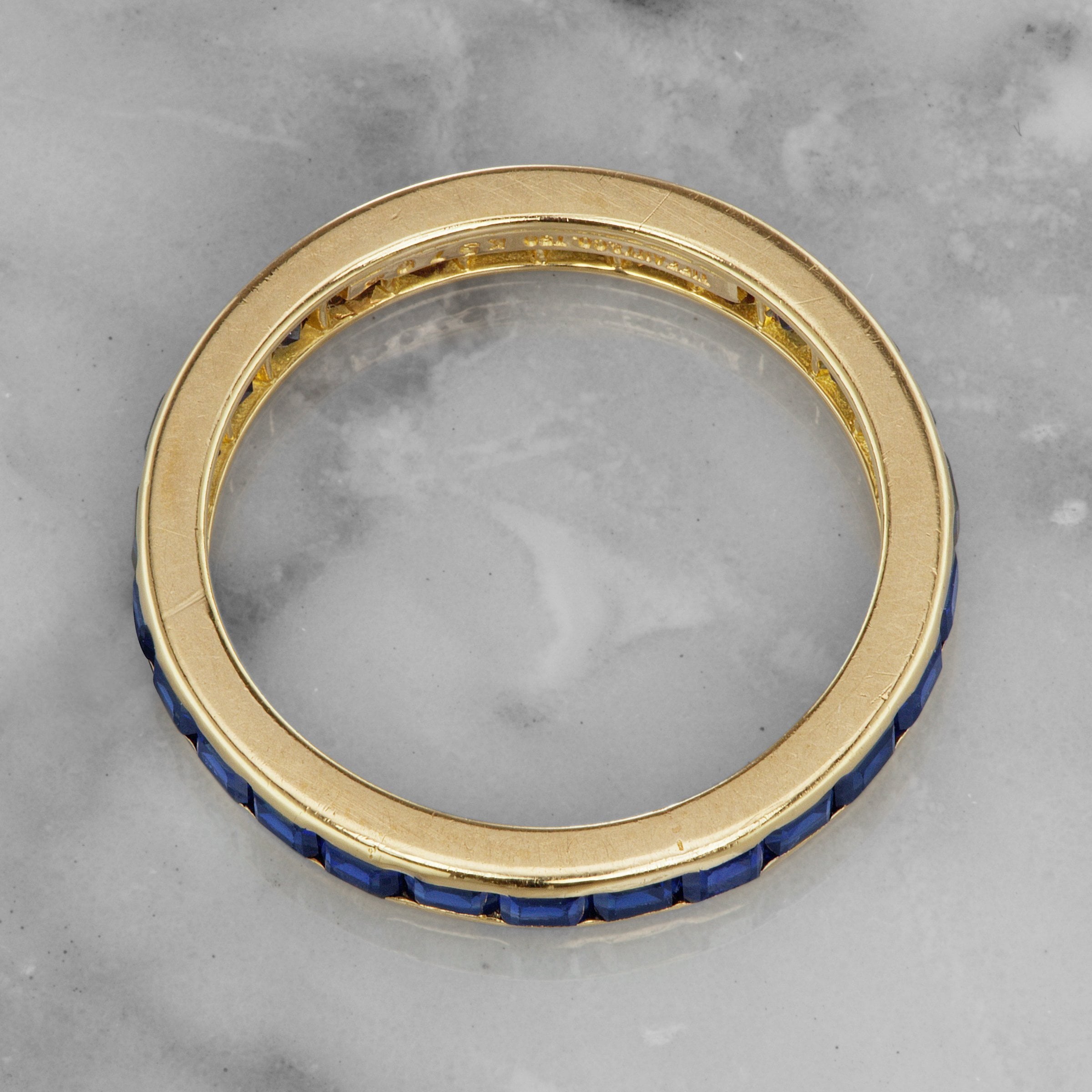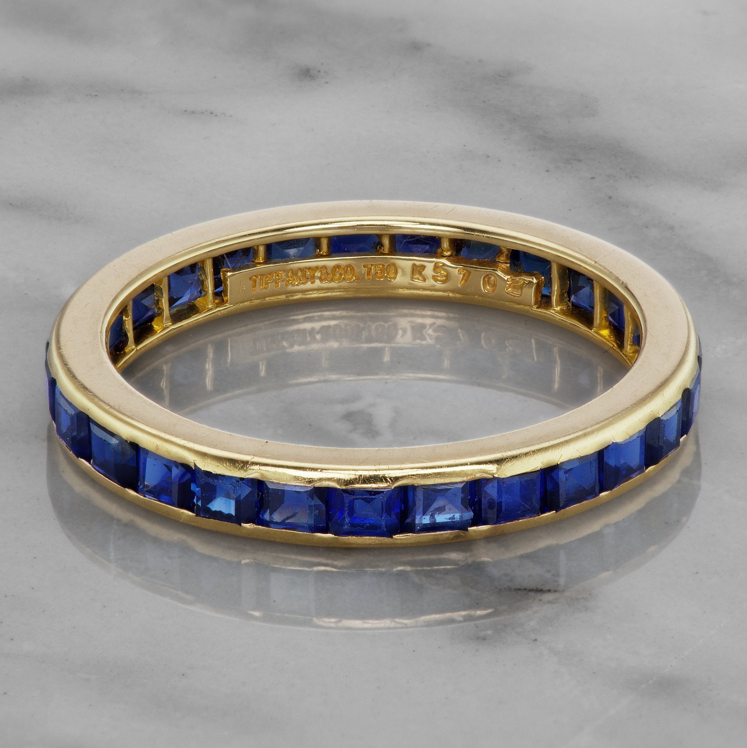 The Alia ring is a Vintage Tiffany sapphire eternity band. This Tiffany & Co. ring features square cut sapphires that are channel set in an 18kt yellow gold ring. The ring is size 6 and cannot be resized.