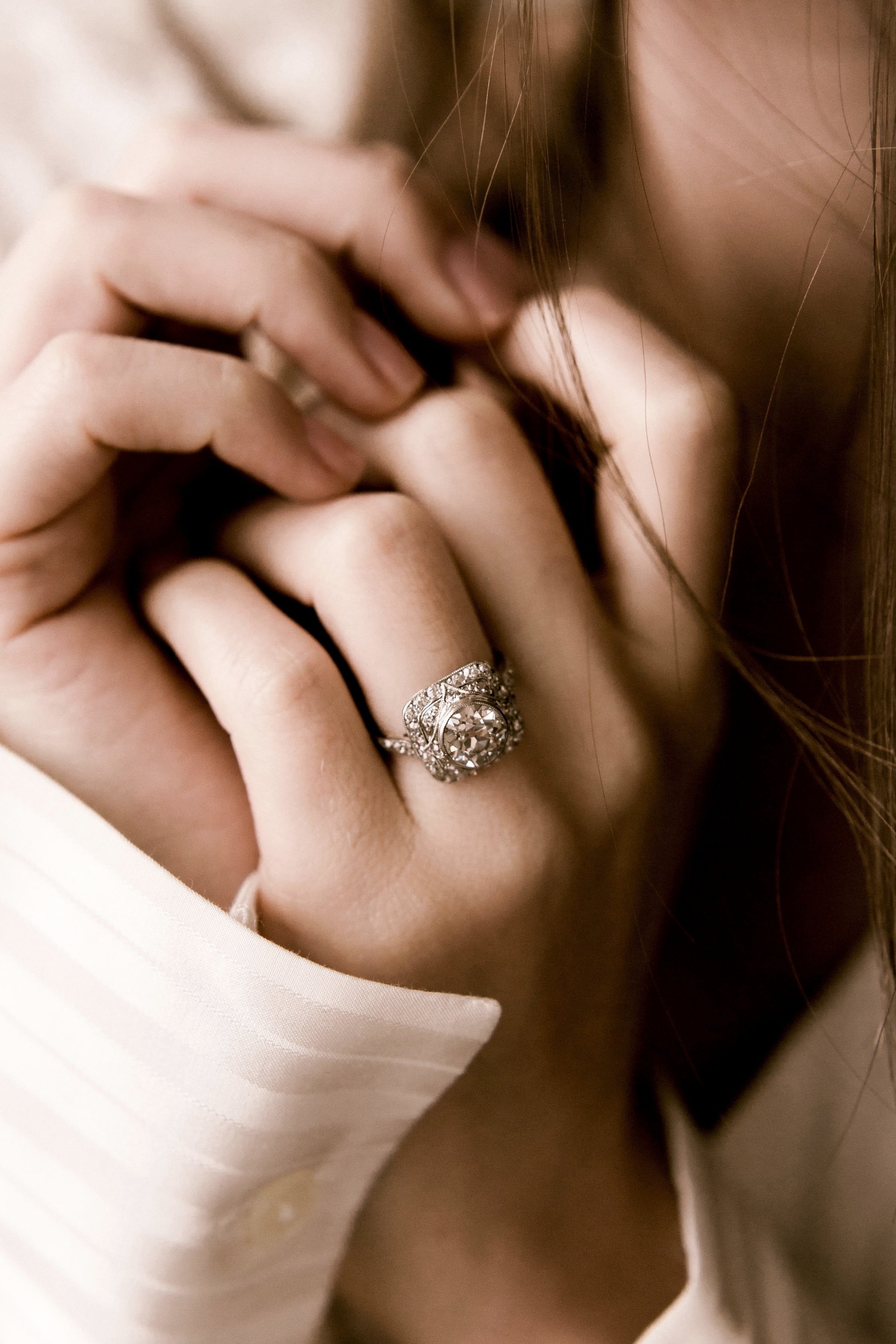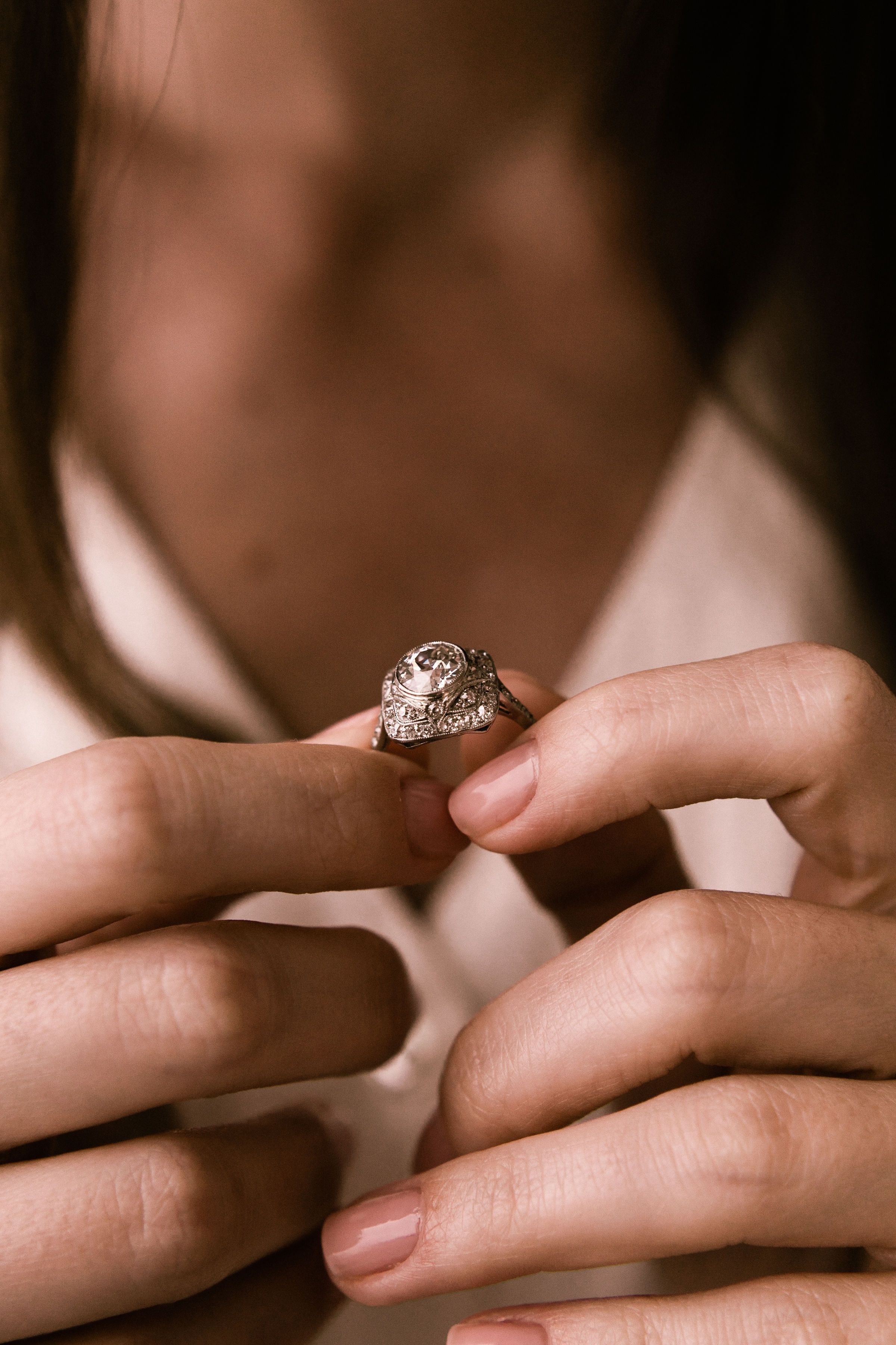 A rare find in this Art Deco beauty! Exquisite details decorate this ring with absolutely stunning diamonds decorating the unique shape, yet still feeling very delicate with a dainty band and light and airy setting!