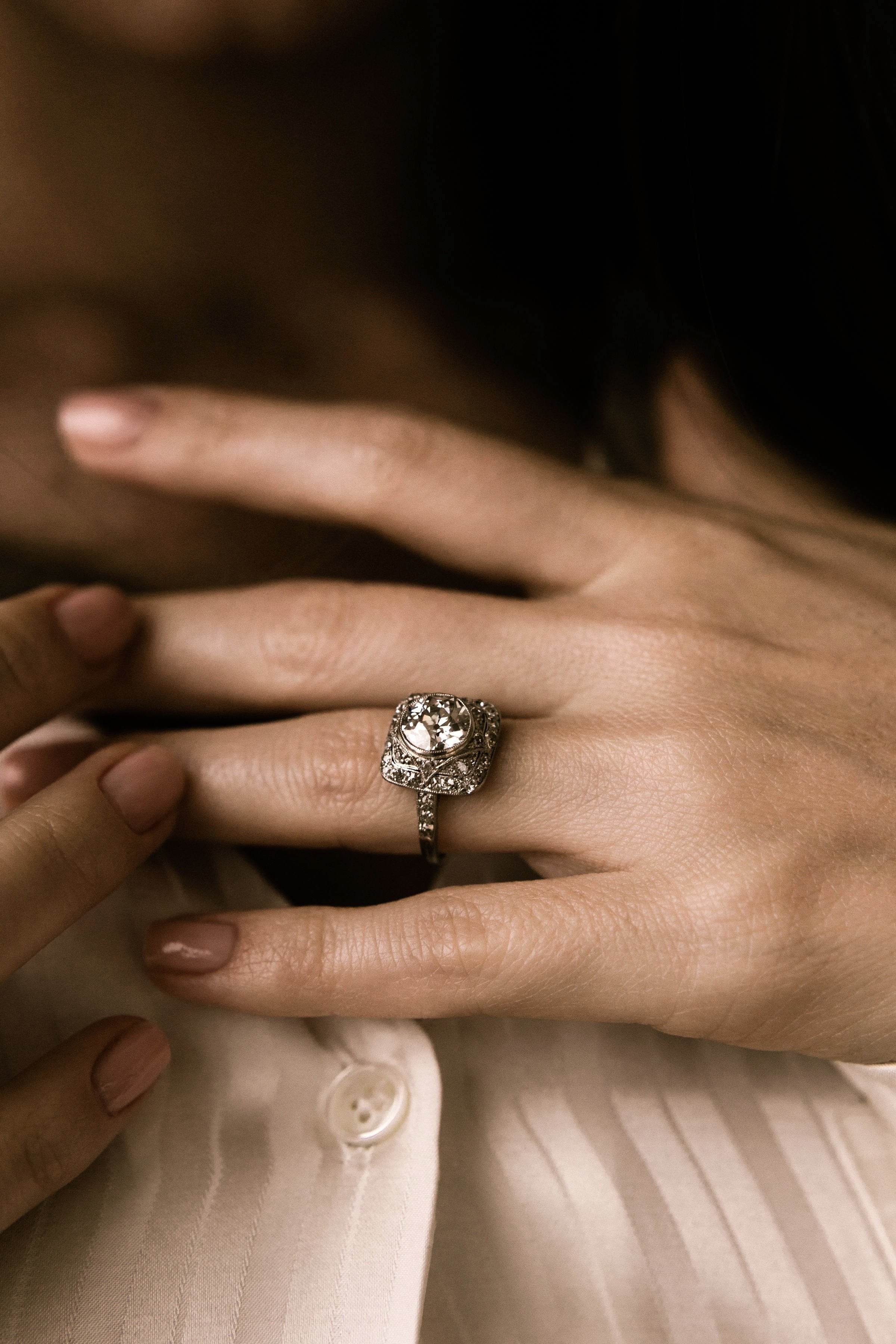 The Camille Ring is a gorgeous Art Deco piece circa 1920! This beautiful square engagement ring centers a GIA Certified 1.91 carat old European cut diamond of I color, VS2 clarity. The diamond is bezel-set in a platinum setting and is surrounded by 28 small old European cut diamonds that are set throughout the square face in a gorgeous pattern with millegrain detail. Each shoulder is lined with an additional three old European cut diamonds with fluting detail down the shank. The side diamonds all combine for approximately 1.02 carats. The ring is size 6.25 and can be resized!