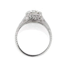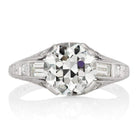 The Connor ring is an Art Deco diamond engagement ring. The ring centers a GIA certified 2.05-carat transitional cut diamond of J color, VS2 clarity. The stone is set in a platinum setting. Twelve single cut diamonds are bead-set throughout the setting of the ring. A horizontally-set baguette decorates each shoulder. The ring is currently size 6.25 and can be resized!