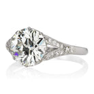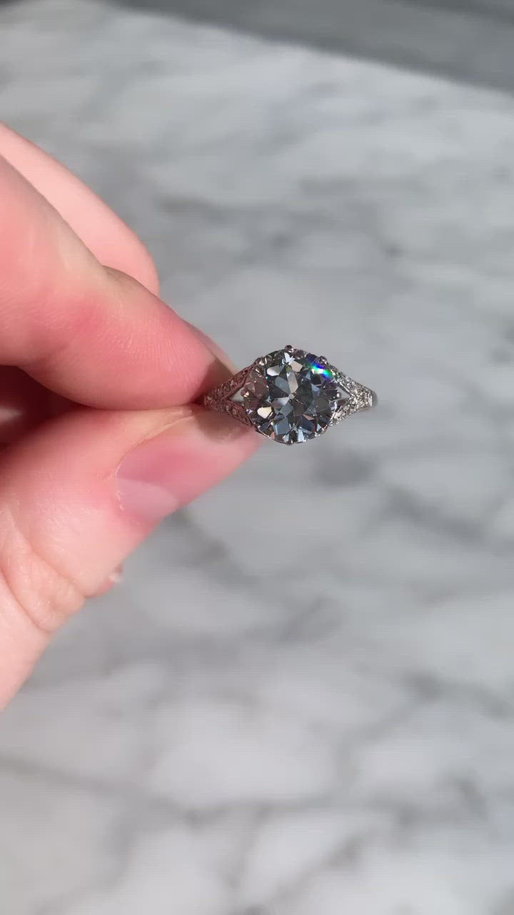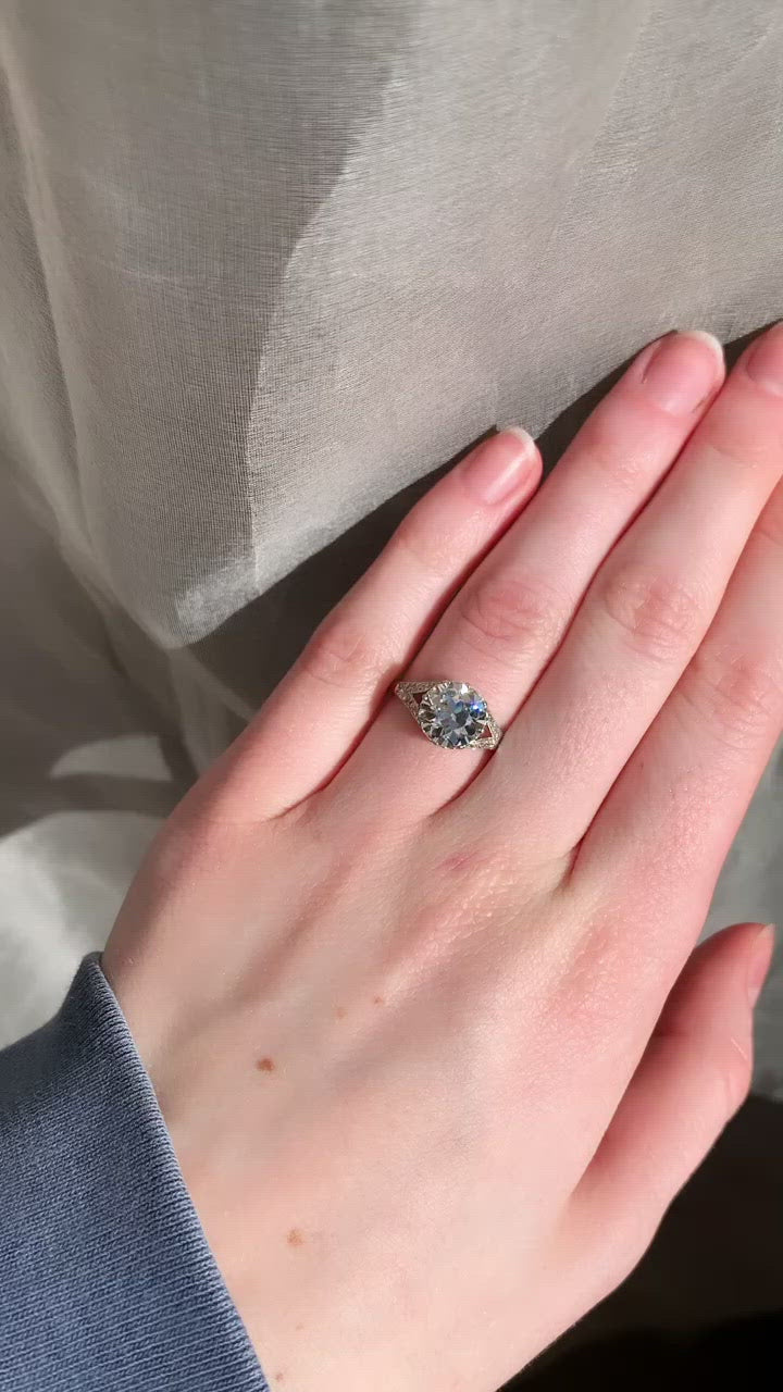 The Mckay ring is a vintage diamond engagement ring from the Art Deco Era. The ring centers a GIA certified 2.66-carat transitional cut diamond of L color, SI1 clarity. The stone is set in a platinum setting with a split shank lined with 18 small diamonds. The ring is currently size 7.75 and can be resized!