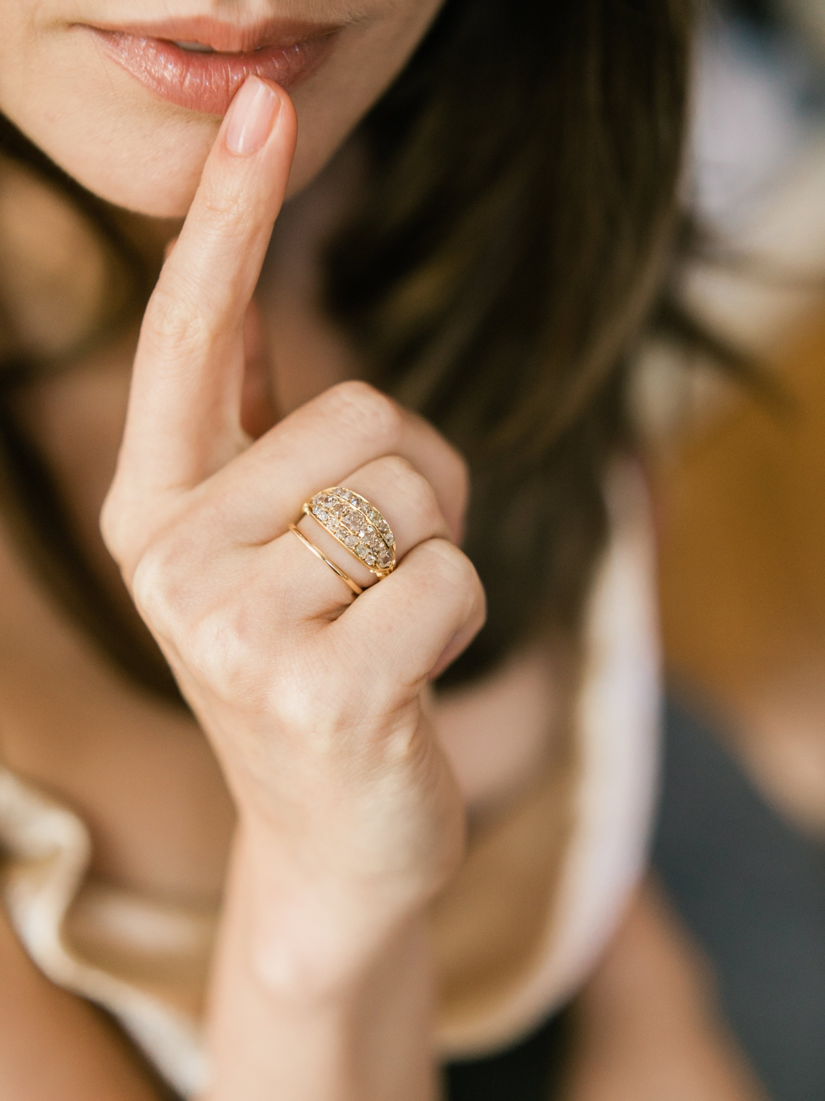 This ring is such a great find! The three rows of old mine cuts are so alluring! This could make a great right hand ring or a fantastic engagement ring for those who are looking for more of a "band style" as their engagement ring! Stack it with bands for a fun look!