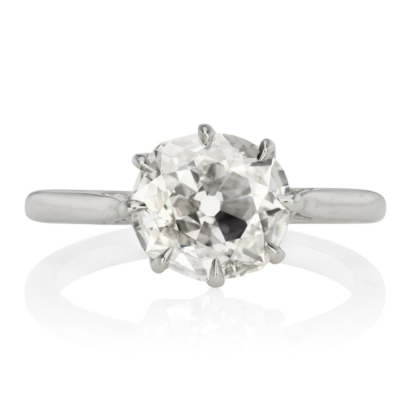 This center stone is absolutely gorgeous! A slightly flatter old mine cut diamond that has that unique shimmer classic of the cut and it is set East-West for a unique twist. The setting is clean and simple and ready to be paired with bands!