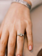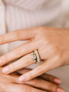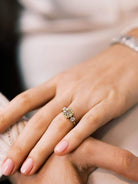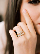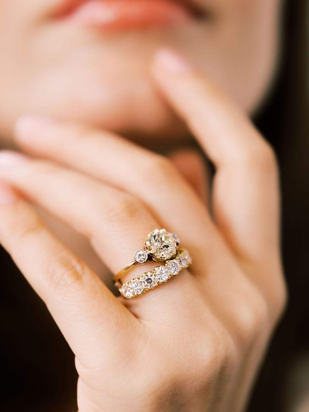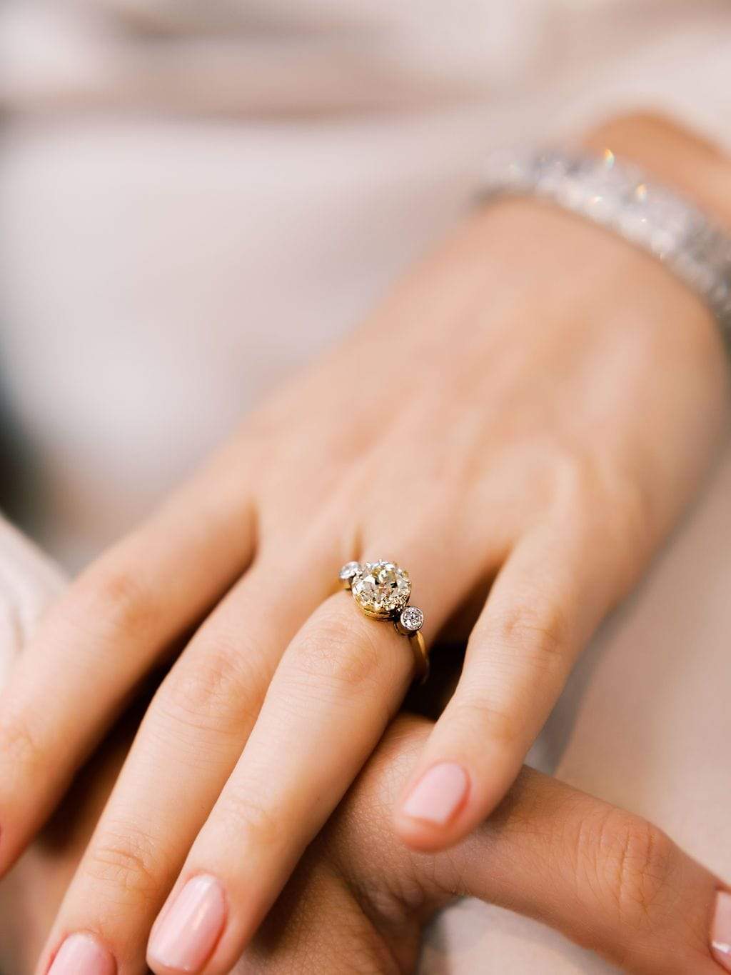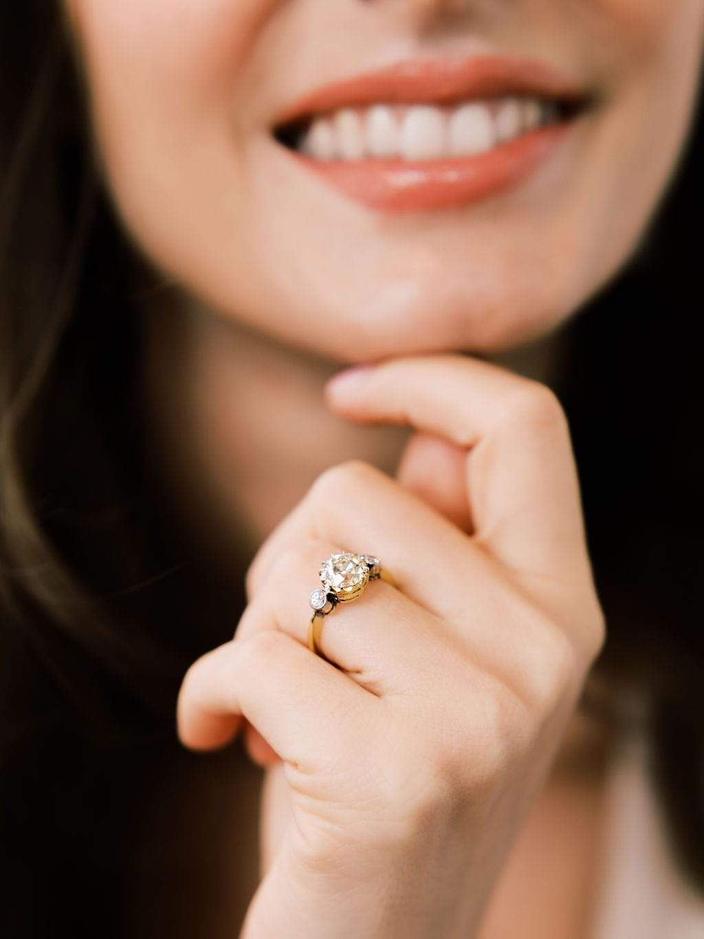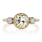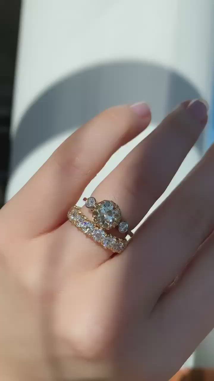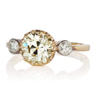 The Lara 1.90 ring is a vintage-inspired VB-made diamond engagement ring. The ring centers a GIA certified 1.90-carat old European cut diamond of Q-R color, VS1 clarity. The stone is set in an 18-karat yellow gold setting. To each side of the center stone is an old European cut diamond bezel-set into a platinum-topped basket. The ring is currently size 6.25 and can be resized!