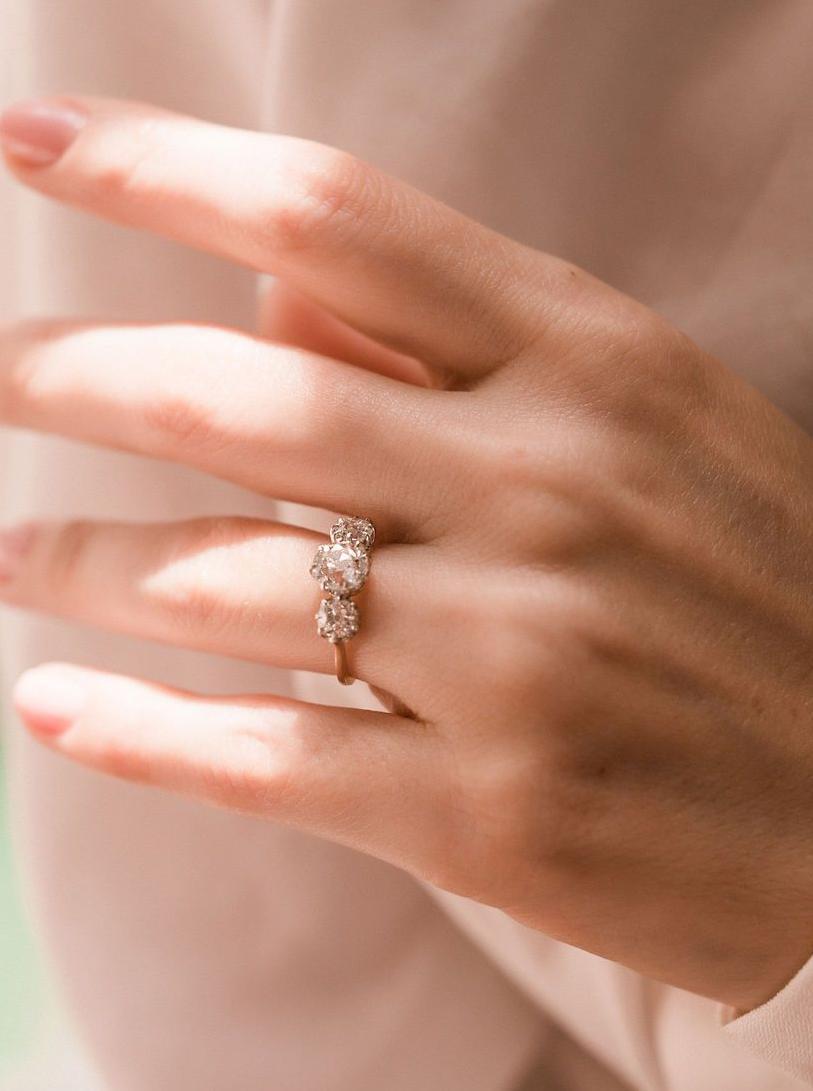 The Marielle 1.30 ring is a VB-Made three stone engagement ring. The Ring centers a GIA certified 1.30 carat old European cut diamond of I color, SI1 clarity. To each side of the center stone is an old European cut diamond of approximately I-J color, VS clarity combining for a total of approximately 0.80 carats. The diamonds are set in in platinum baskets atop an 18 karat yellow gold ring. The ring is currently size 4.5 and can be resized!