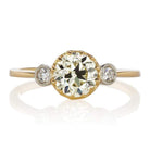 The Lara 0.92 ring is a vintage-inspired engagement ring made by us right here in NYC using authentically antique diamonds. The ring centers a GIA certified 0.92-carat Transitional cut diamond of U-V color, SI2 clarity. The stone is set in an 18 karat yellow gold setting with an old European cut diamond to each side set in a platinum bezel, both combining for approximately 0.10 carats. The ring is currently size 5.5 and can be resized!