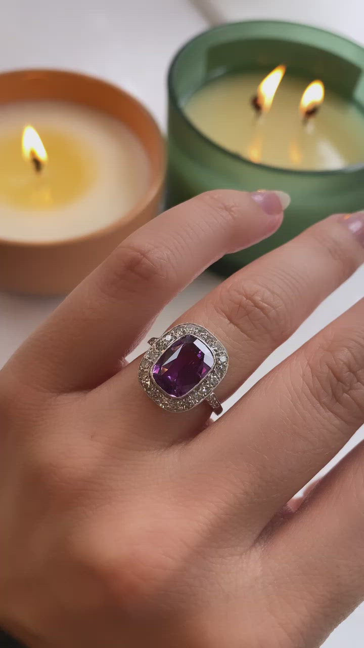 The Anjali ring is an authentic vintage ring from the Edwardian Era. The ring centers a GRS-certified 4.45-carat cushion cut no-heat Purple sapphire. The stone is bezel-set in a platinum setting with twenty single cut diamonds set into a platinum halo surrounding it. Three additional diamonds are set into each shoulder. The ring is currently size 6 and can be resized!