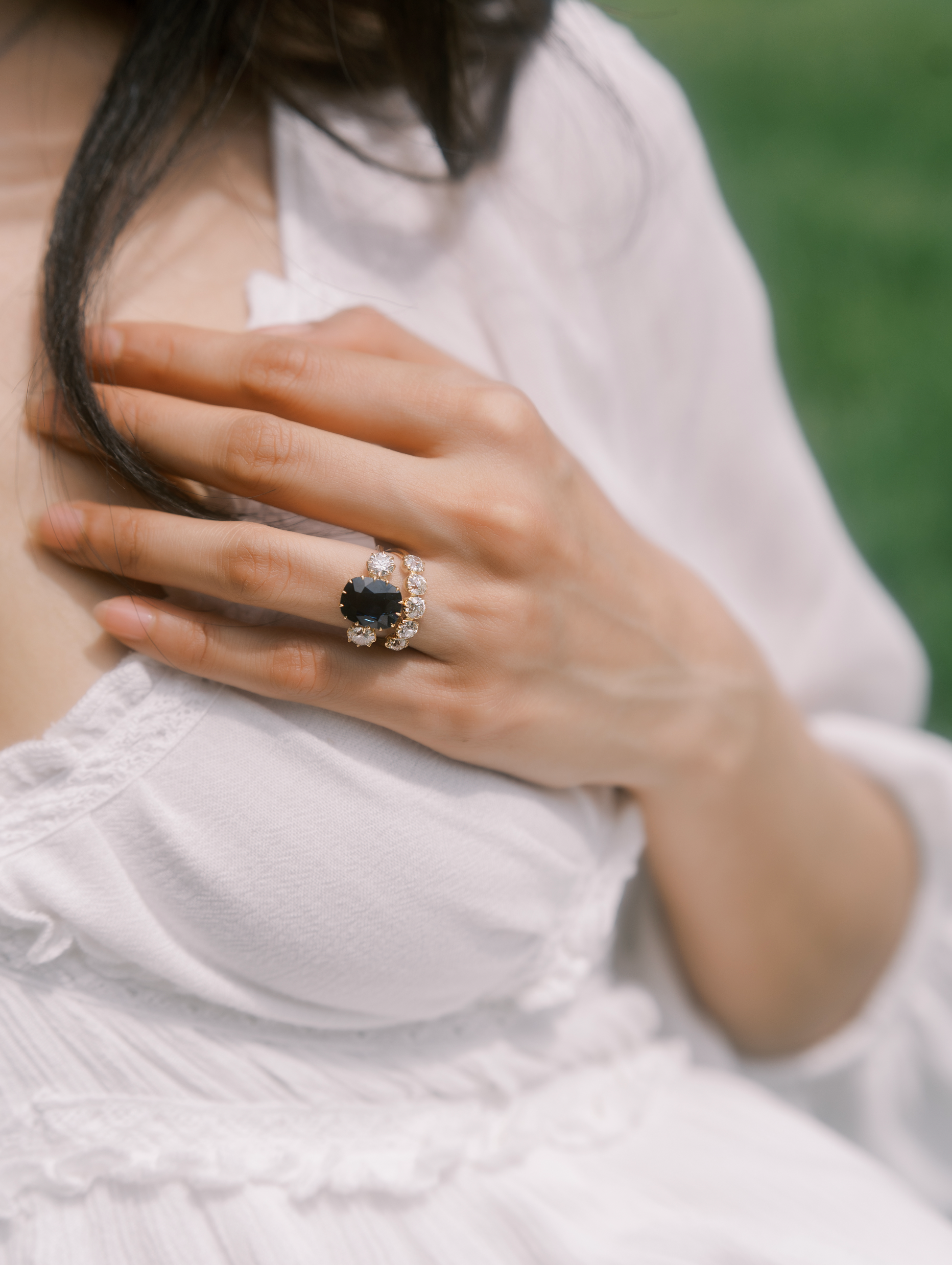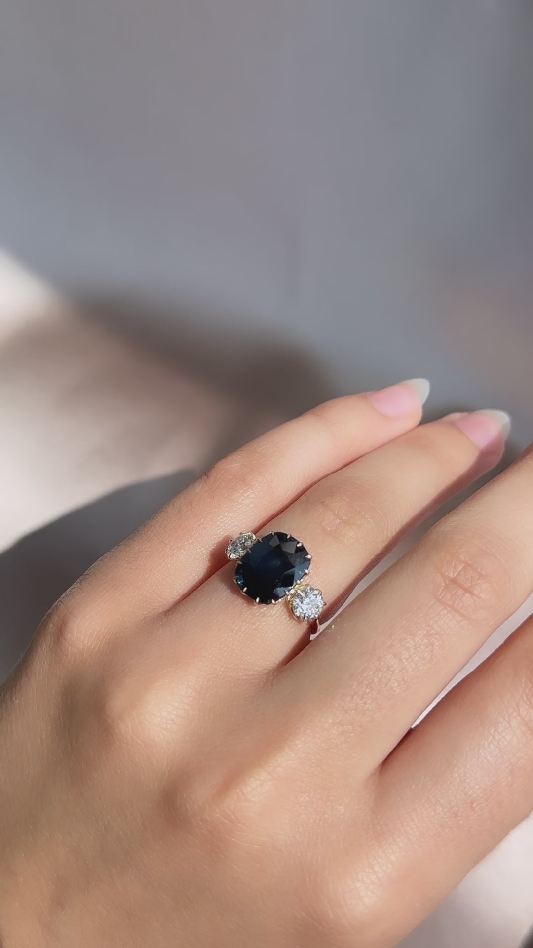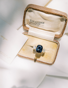 This deep and stormy sapphire has the perfect pillowy outline and a flatter make which allows it to sit nice and low to the finger. It is accentuated by two bright, shimmering antique diamonds which creates a beautiful span of stones across the finger.