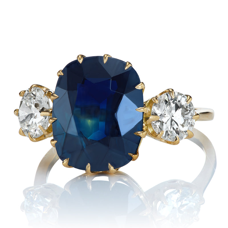 The Mallory 4.88 ring is an AB original design made right here in NYC. The ring centers a GIA-certified 4.88-carat No Heat Australian Cushion Cut sapphire. On either side of the center stone is an Old European Cut diamond of approximately J-K color, both totaling for 1.05 carats. The stones are set in an 18kt yellow gold setting. The ring is currently size 6.25 and can be resized!