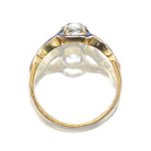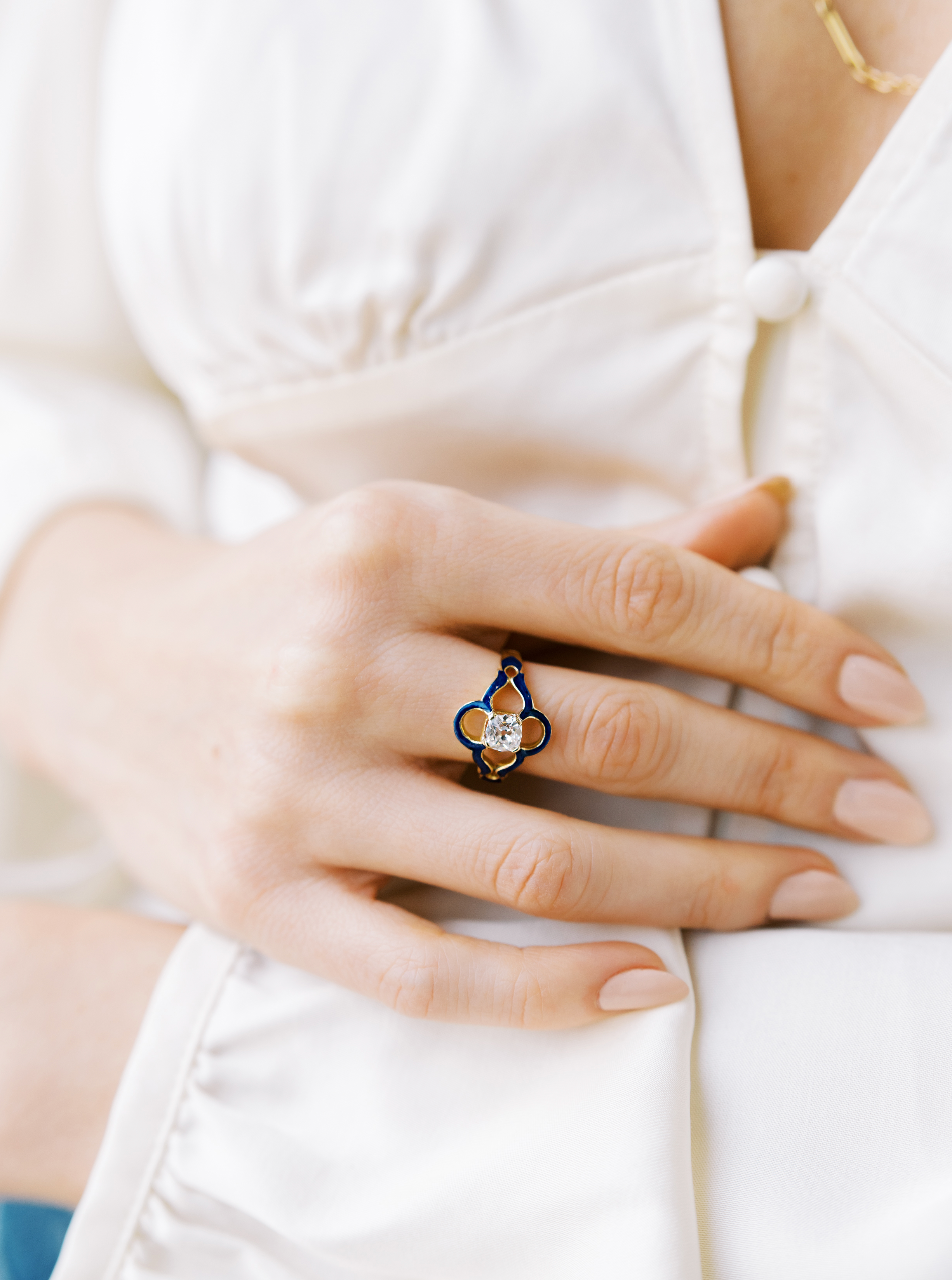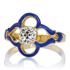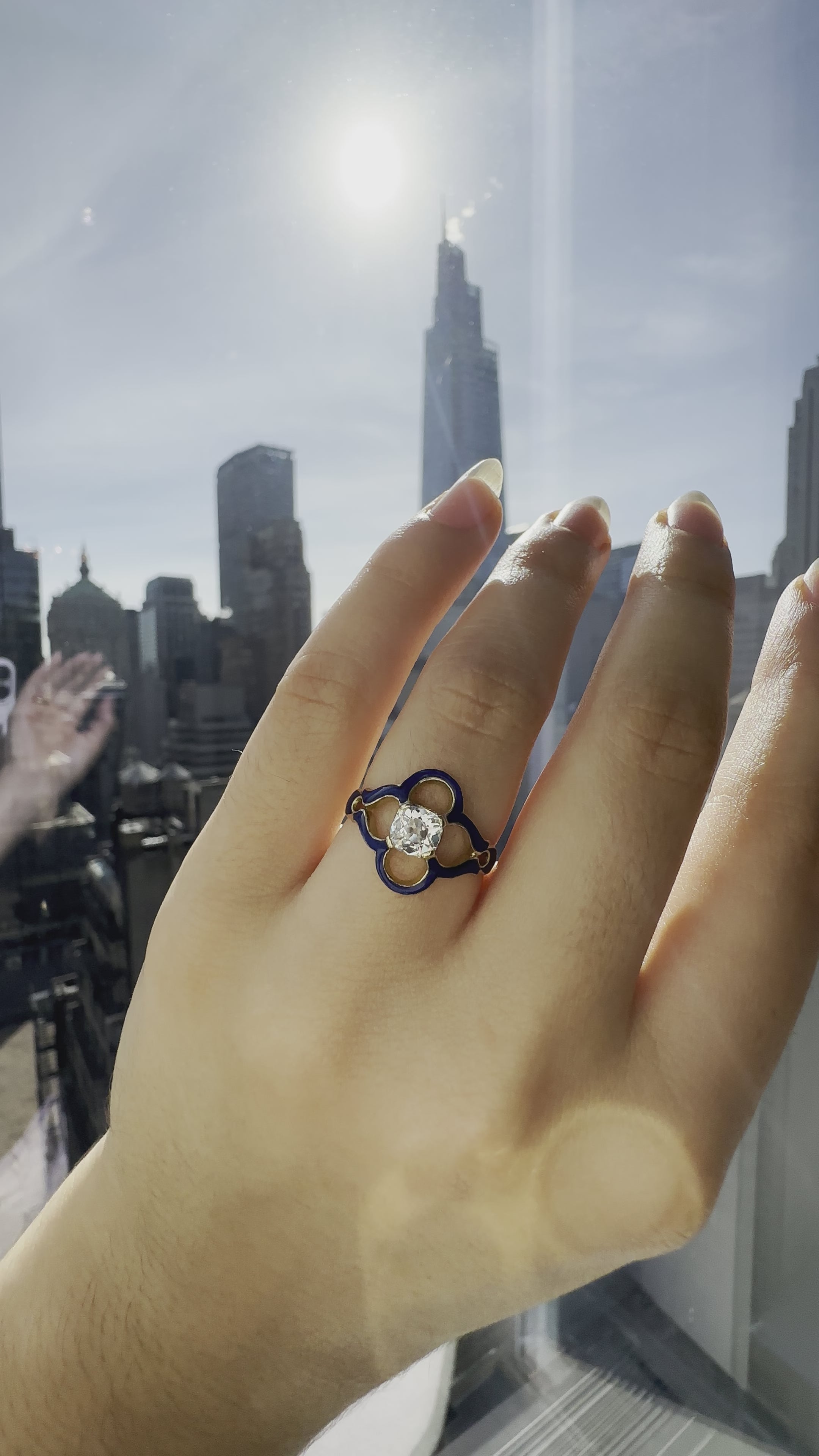 The Cho ring is an authentic vintage diamond ring from the Victorian Era circa 1858. The ring centers an approximately 0.70-carat Old Mine Cut diamond of approximately I-J color and VS clarity. The stone is set in an 18kt yellow gold setting amidst a uniquely shaped halo of gold topped with blue enamel. The ring is currently size 6.5 and can be resized!