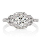 The Apple ring is an authentic vintage engagement ring from the Art Deco Era. This unique Art Deco Engagement ring centers a GIA certified 1.06-carat transitional cut diamond of I color, SI2 clarity. The stone is set in a platinum box-style setting. Fourteen additional diamonds decorate the beautifully made setting with beautiful hand-engravings down the shoulder. The ring is currently size 7.5 and can be resized!