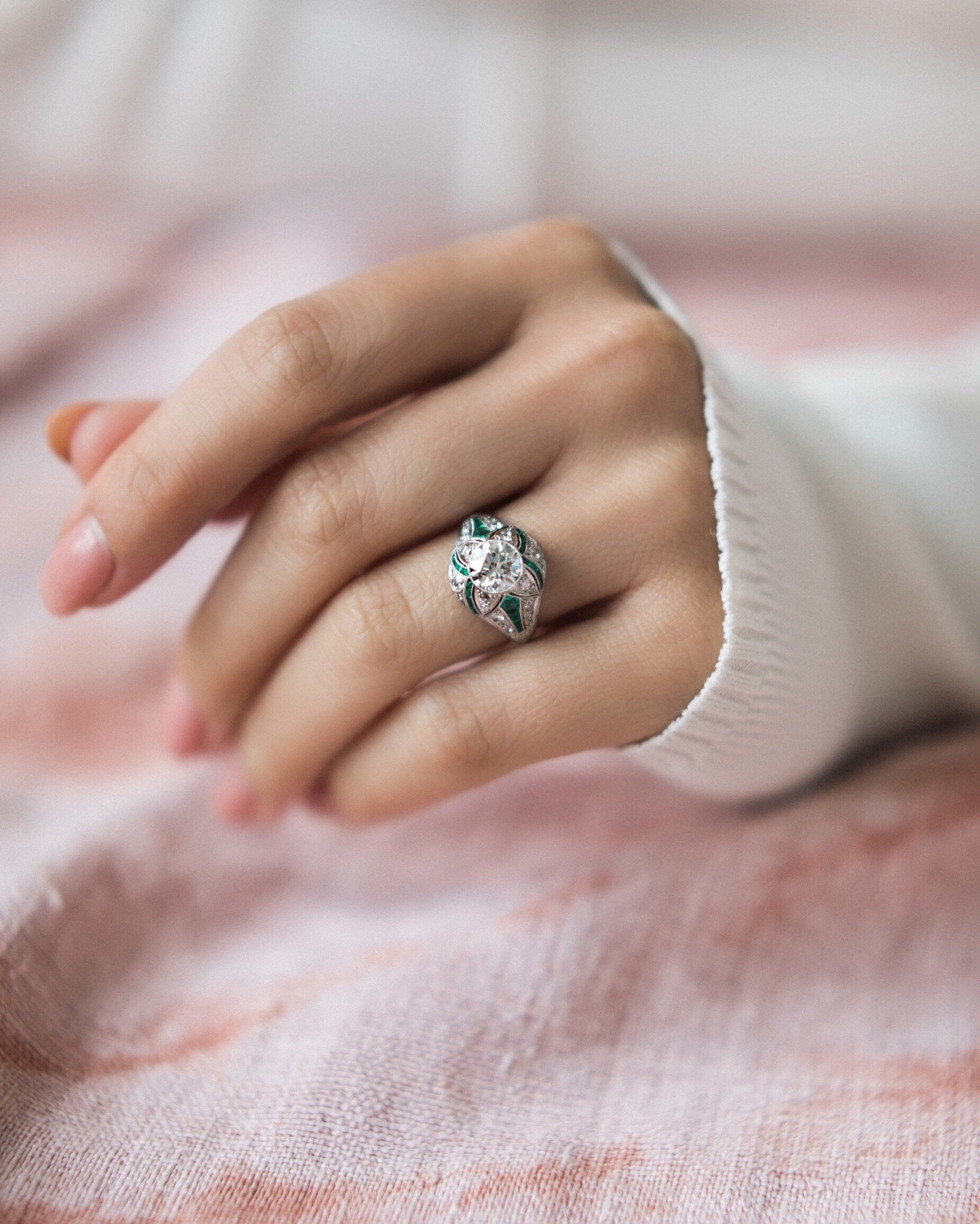 This ring is an incredible piece! The craftsmanship is extraordinary and made with high-quality stones! We love the pop of color from the green emeralds paired with the bright white diamonds! While this is a bold ring, nothing about it is overstated. The central diamond is still the main attraction with beautiful, sparkling clarity. The calibre cut emeralds and the millegrain details help to tie everything together. Every stone fits so perfectly in a lovely Art Deco arrangement. The pattern is both floral and geometric, which helps to make the overall shape of the ring so interesting! The Minerva ring is an all-around unique emerald engagement ring with gorgeous diamonds!