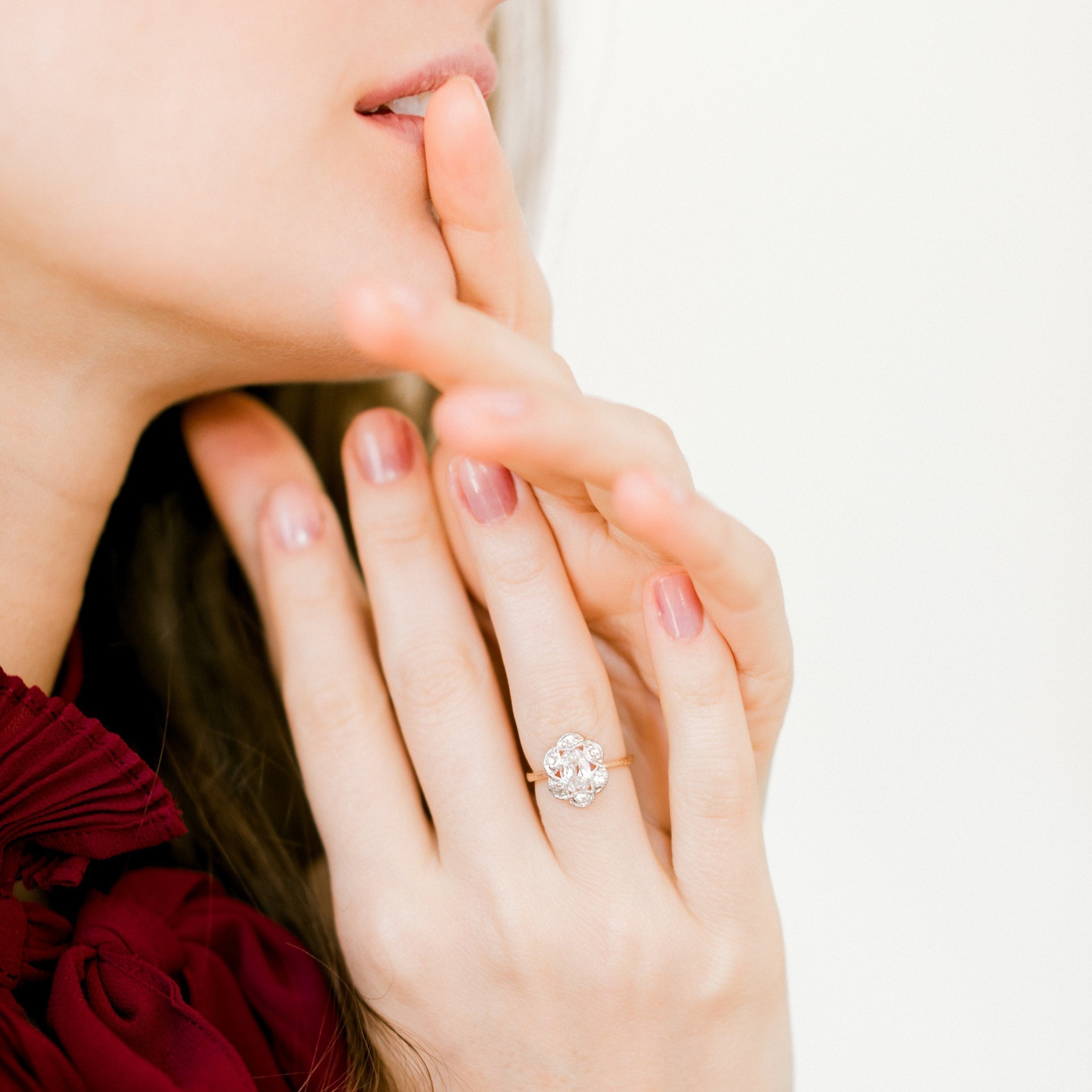 The center oval cut diamond on this ring is full of sparkle! We adore the romance it has with the floral pattern of the surrounding diamonds and the detail work! The low profile face of the ring sits on the most beautiful and delicate 18k gold band!SHOP RISK FREE