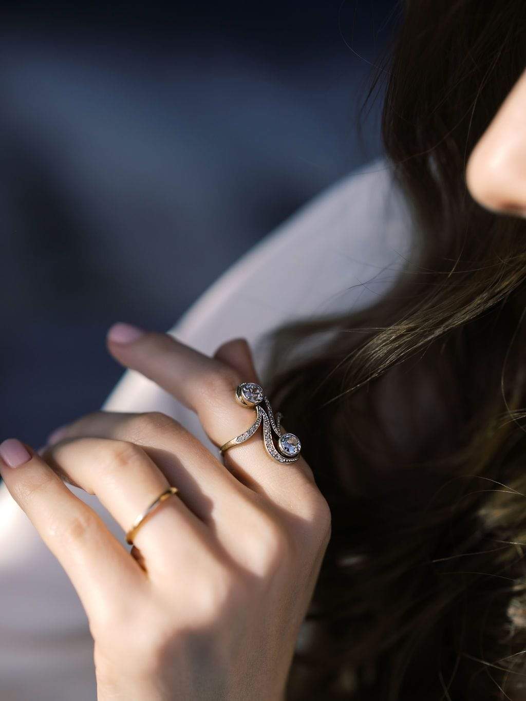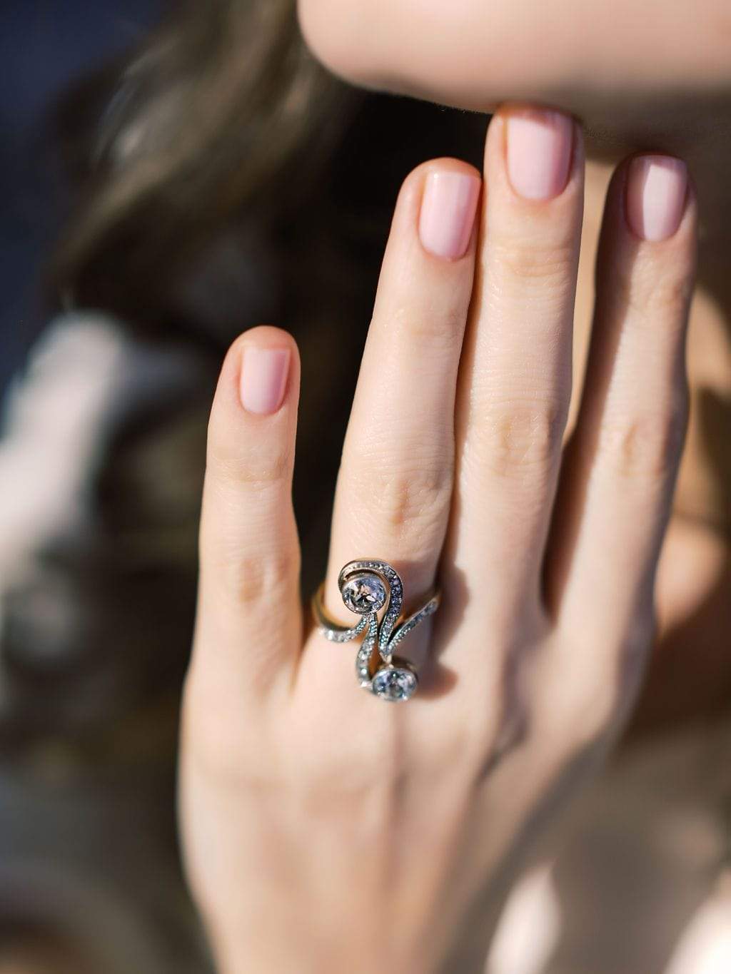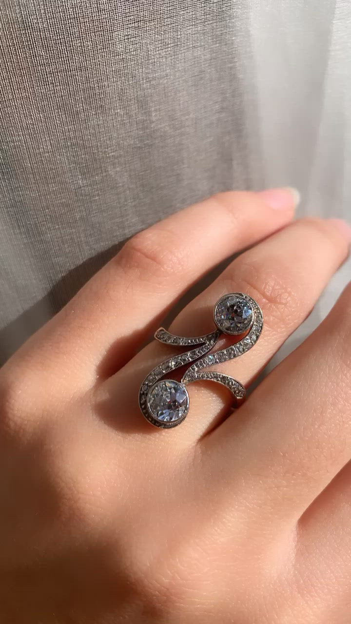 The Venus Ring is an Art Nouveau cocktail ring of European origin. The ring features 2 old European cut diamonds that are bezel-set in a platinum-topped 18kt yellow gold setting. Both old European cut diamonds are approximately 0.85 carats each of J-K color, SI2-I1 clarity. The diamonds are set in this ultra-chic up-the-finger ring that has 28 stones set throughout the curving design. The ring is size 6.25 and can be resized.