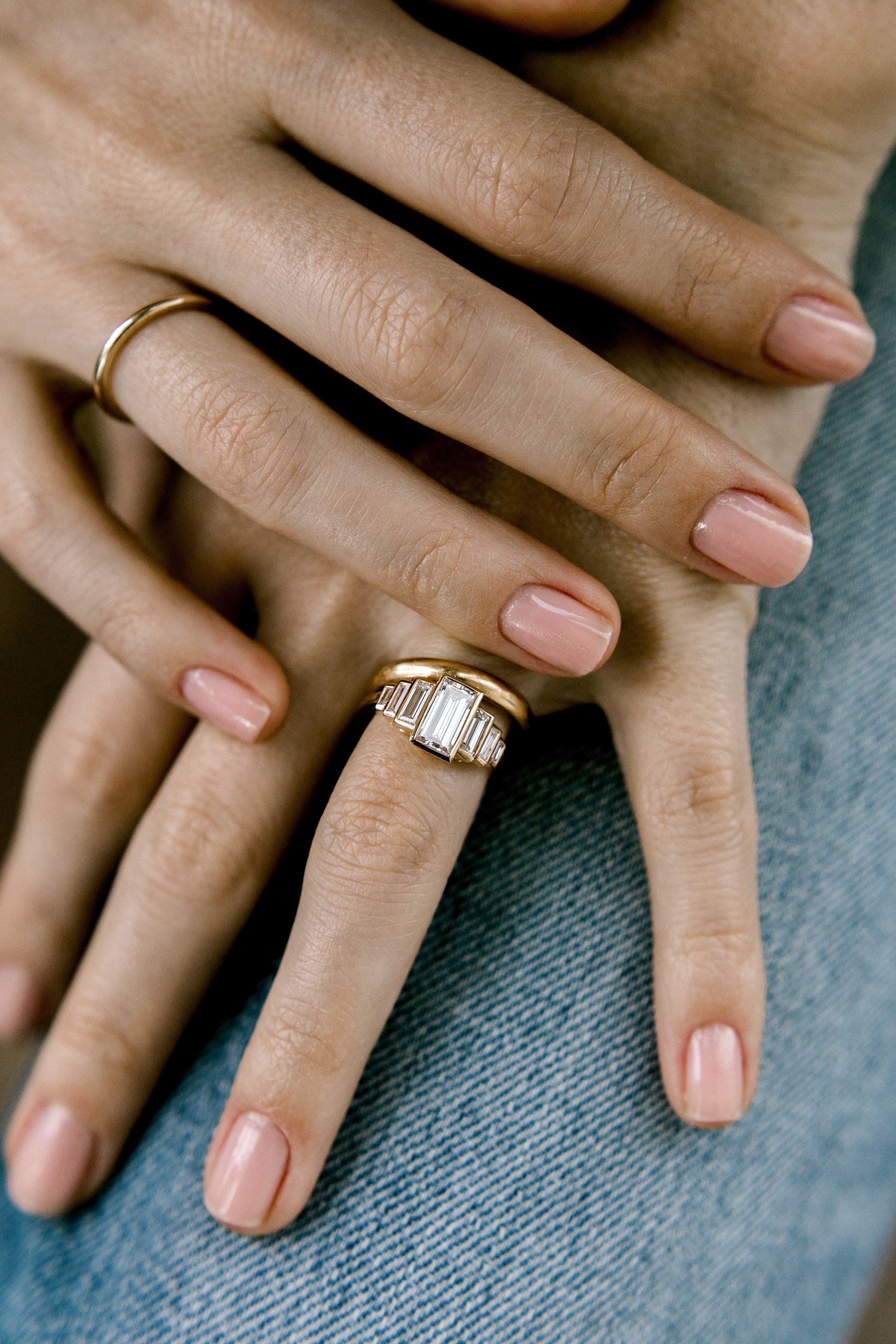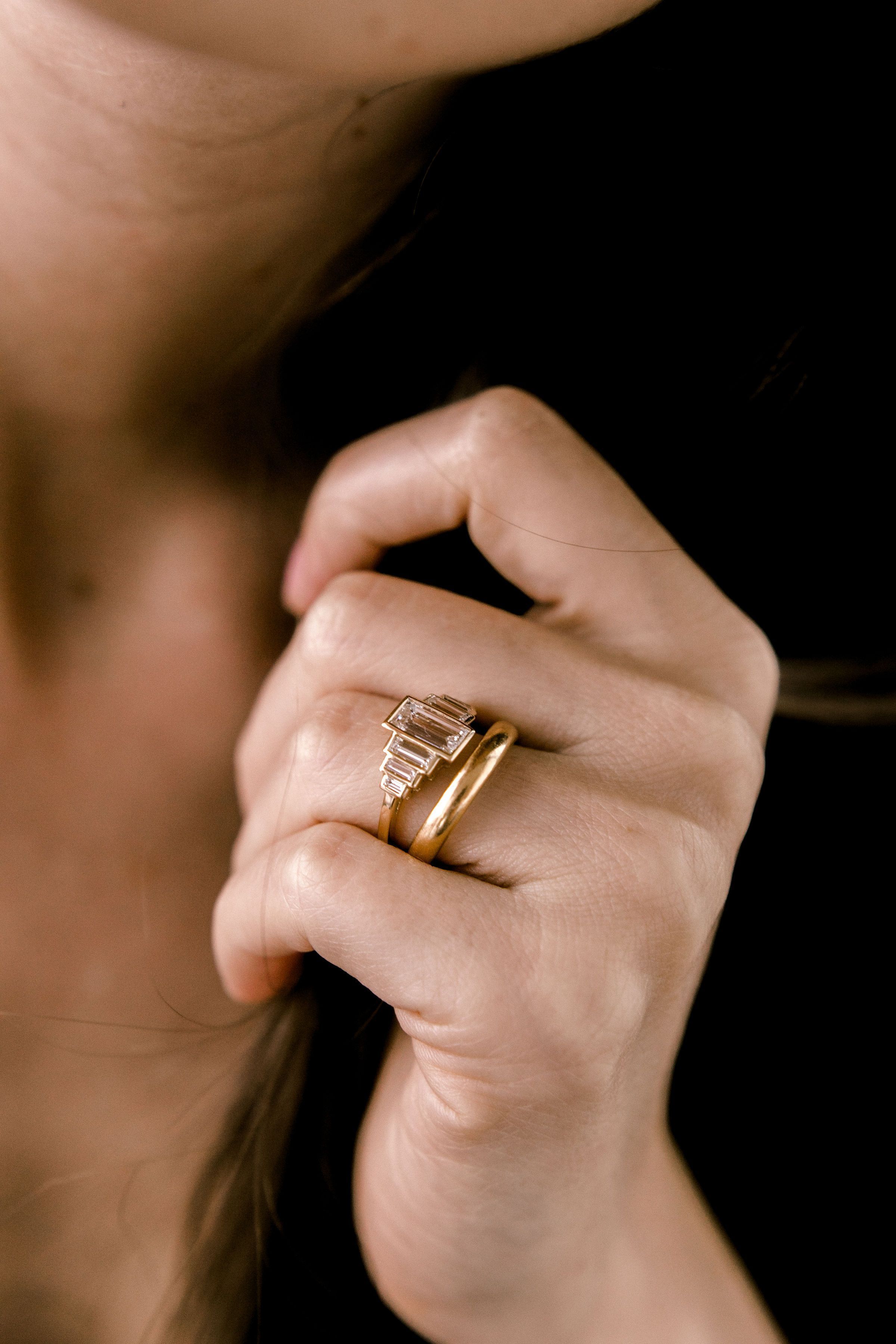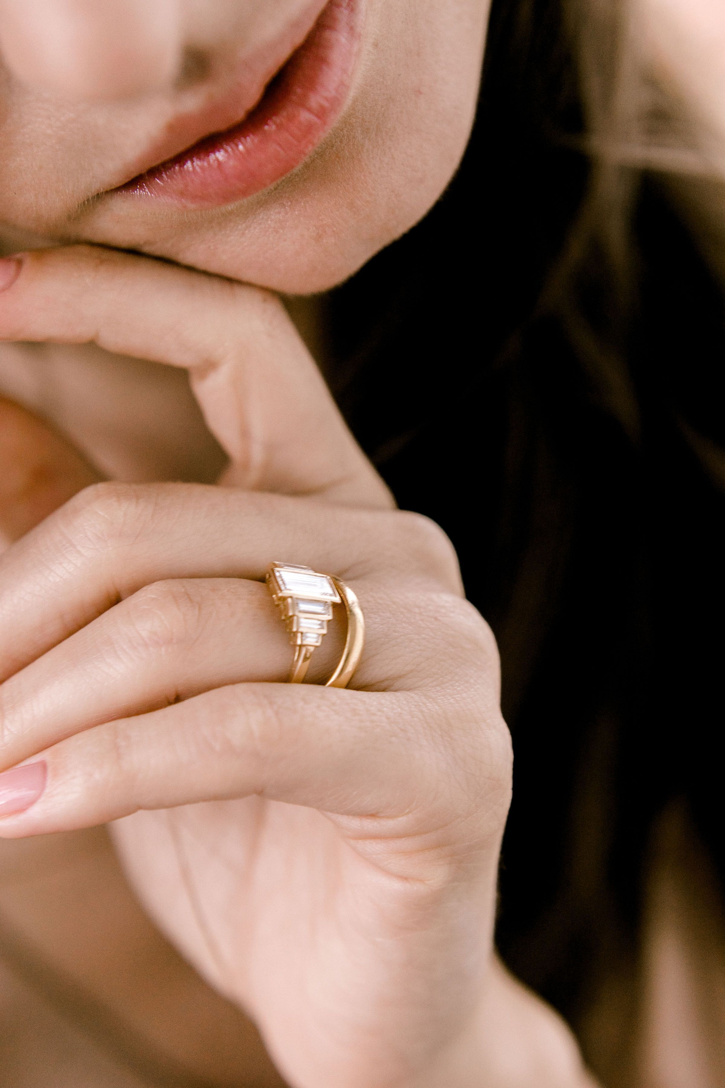 A super sleek and clean ring with definite Art Deco vibes! The ring is super low-profile with smooth bezels that allow for very easy wear!