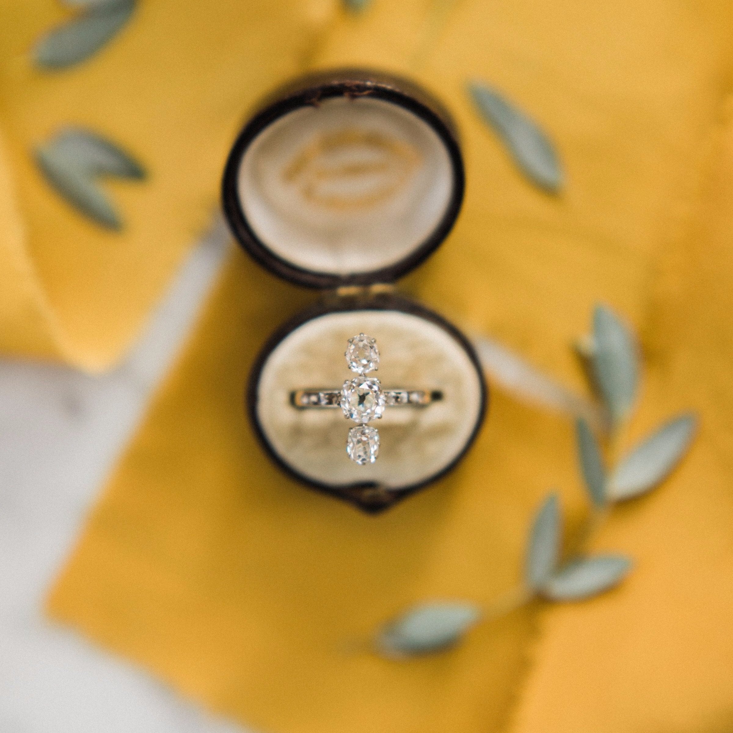 This ring is amazing! A unique spin on the three stone with a vertical layout. The diamonds are all cut so beautifully with tons of antique charm that causes the prettiest of pastel flashes of light! Low profile and incredible!
