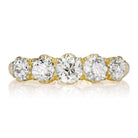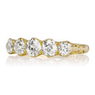 This is a gorgeous authentic antique band from the Victorian era circa 1863. The band has 5 old European cut diamonds of approximately H-I color, VS-SI clarity that combine for approximately 1.30 carats. The gallery has that gorgeous scrollwork that we see often from this era. The ring is currently size 6.75 and can be resized!