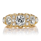 The Romy ring is an authentic vintage diamond ring from the Victorian Era circa 1890. The ring features five Old Mine Cut diamonds of approximately K-L color, VS-SI clarity, combining for approximately 2.00 carats. Between the larger diamonds are six small Old Cut diamonds of coordinating color and clarity combining for roughly 0.10-carats. The stones are set in an 18kt yellow gold setting. The ring is currently sized slightly over a 4.5 and can be resized!