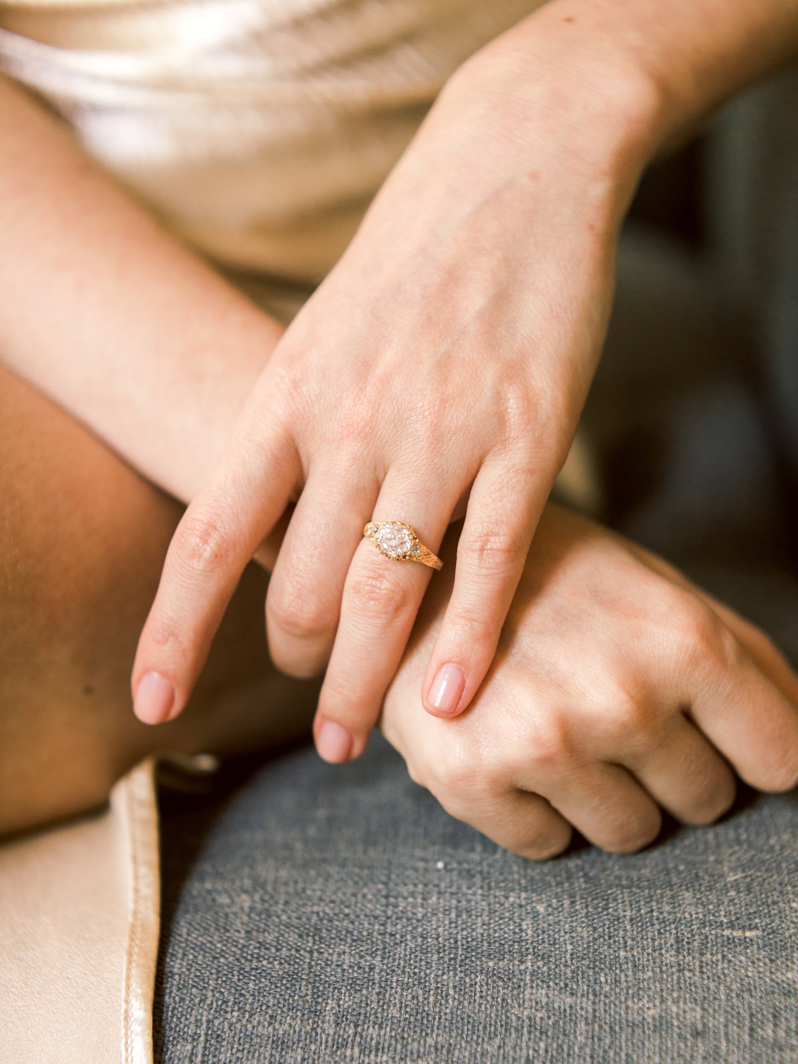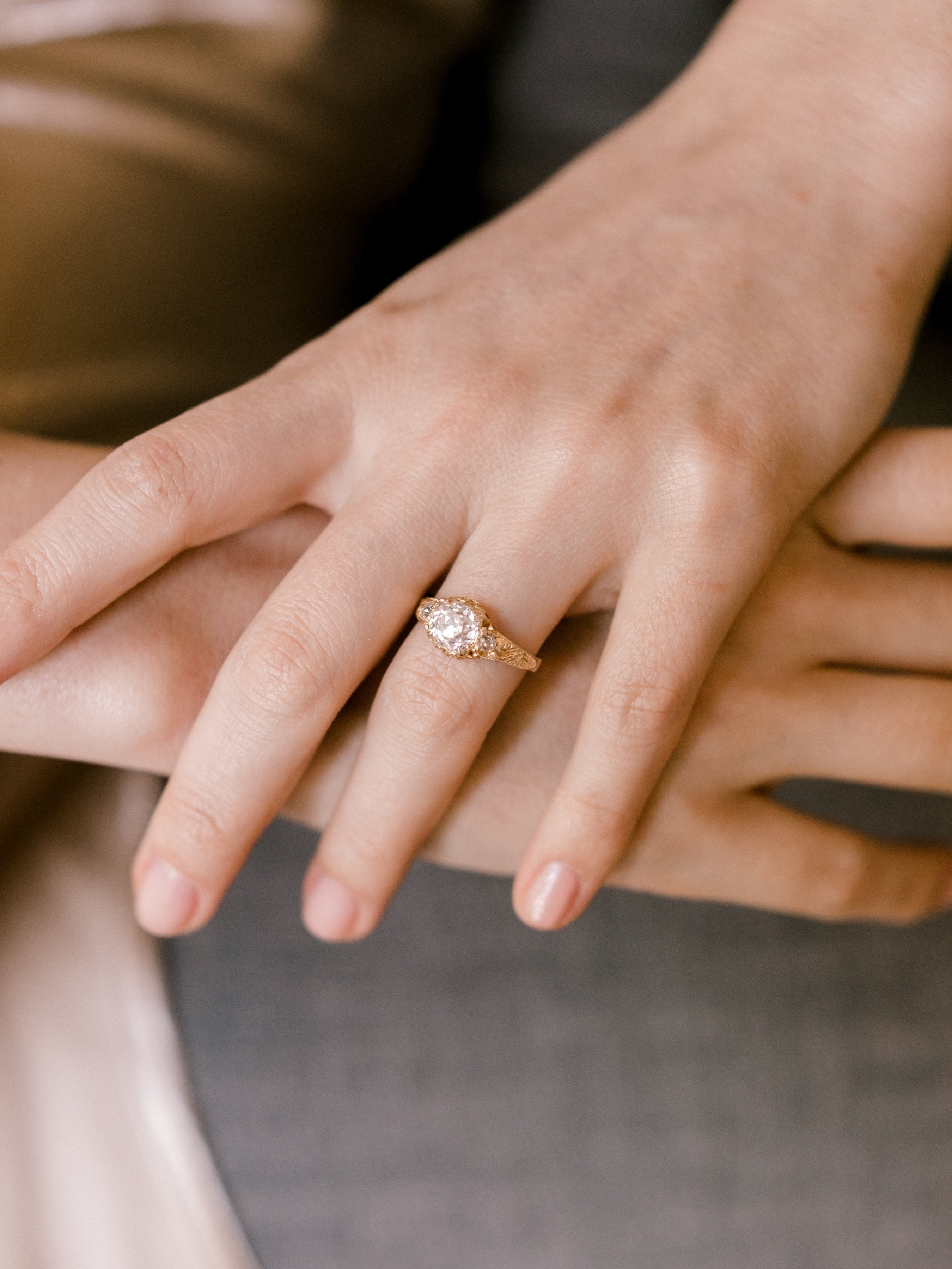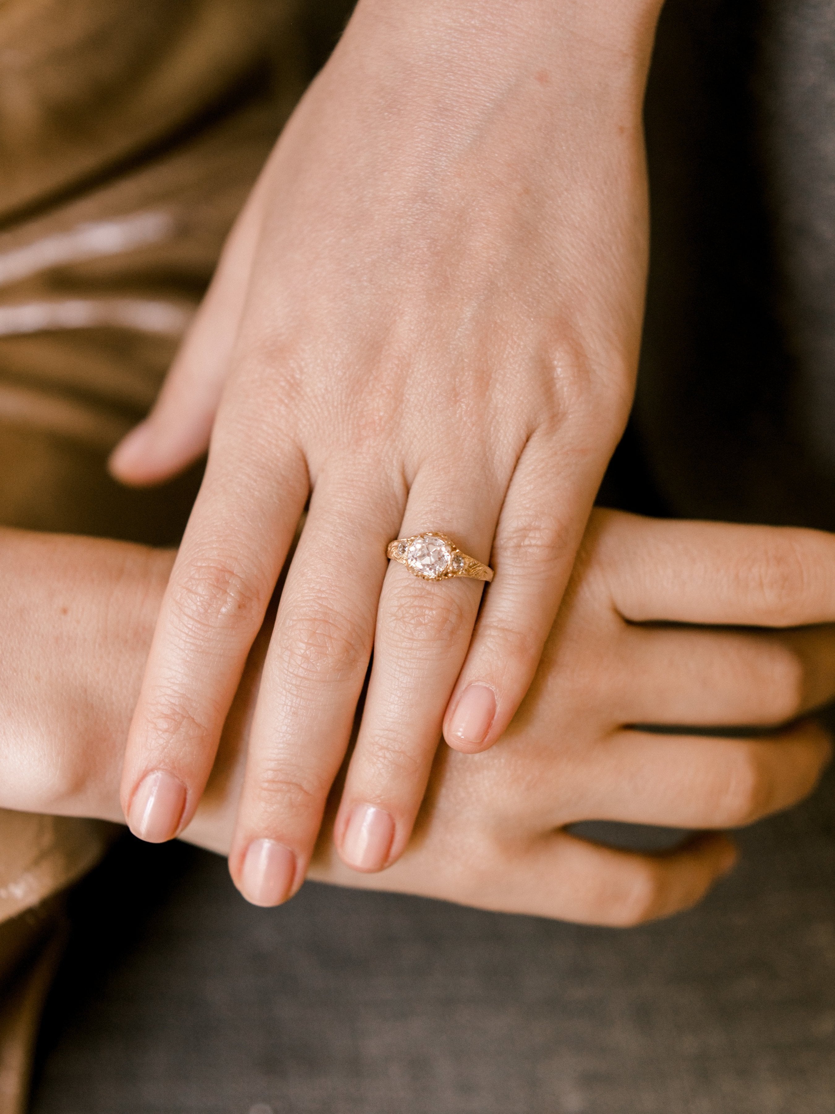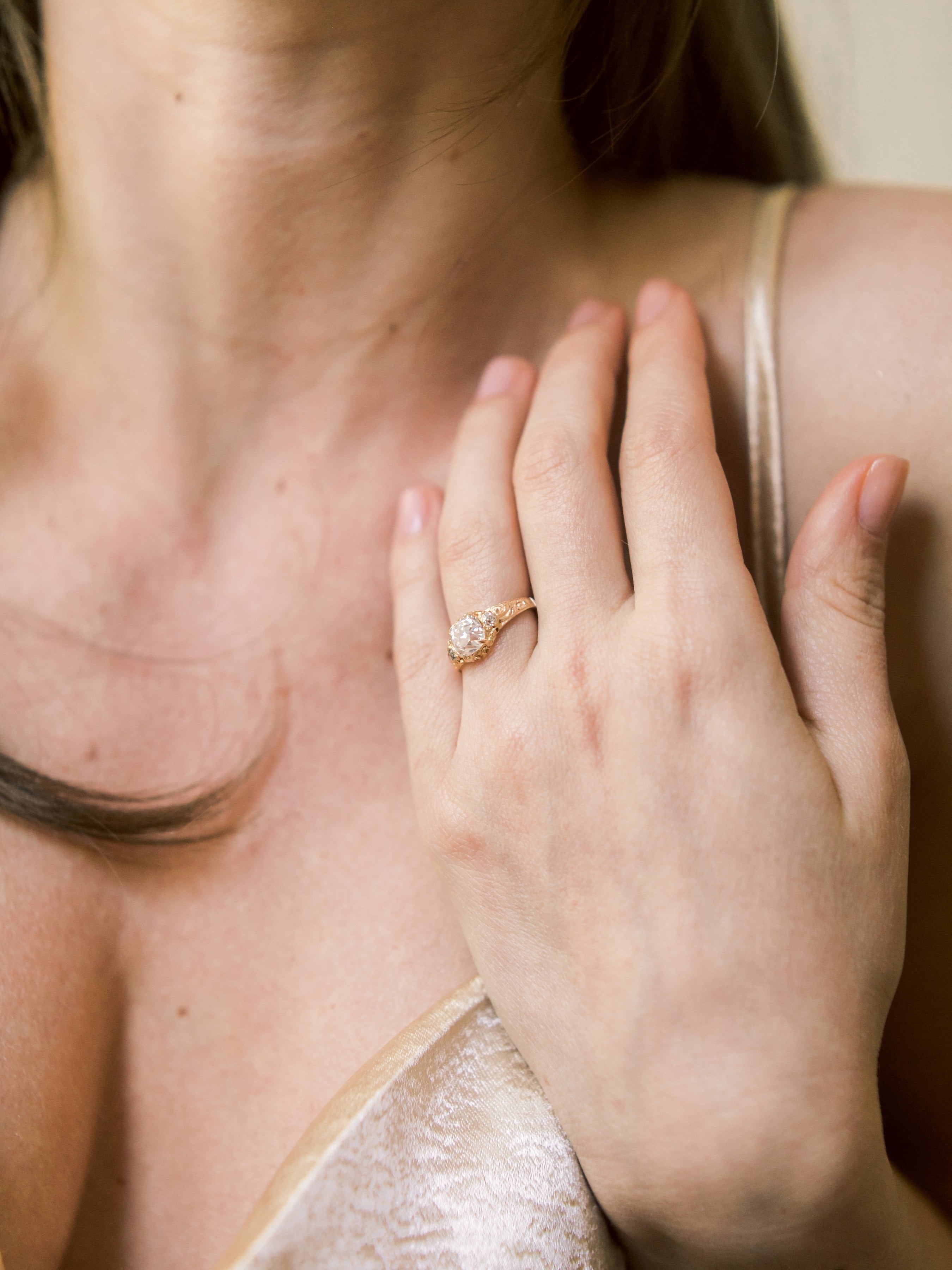 This one is an antique dream! Centering a lovely, cushiony old mine cut and two OECs that add even more sparkle! Super low profile with this ring and tons of Victorian detail to the setting!