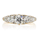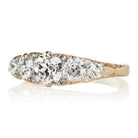 The Pecan ring is an authentic Victorian ring circa 1892. The ring centers an old European cut diamond of approximately 0.75 carats, I-J color, VS2 clarity. Two descending old European cut diamonds are set into each side of the center stone, the first approximately 0.25 carats and the second approximately 0.10 carats. Eight rose cut diamonds are set between the stones. The total carat weight for the ring is approximately 1.50 carats. The ring is 18kt yellow gold. The ring is currently size 8.5 and can be resized!