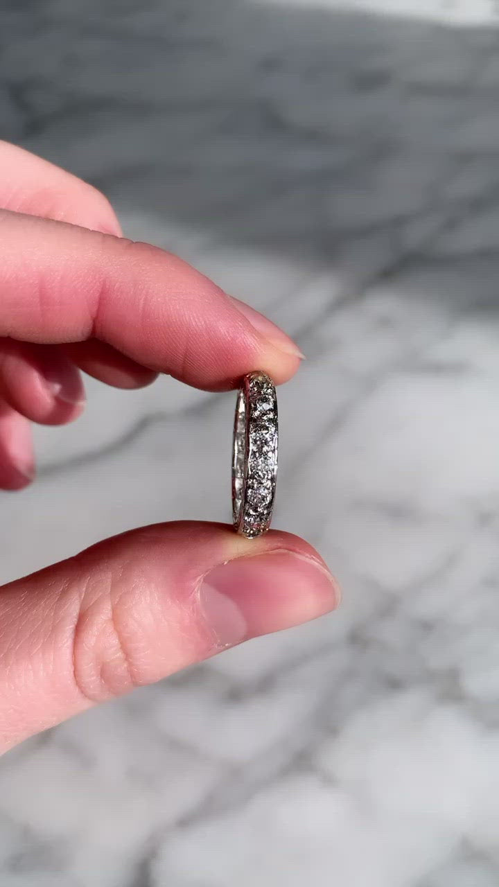The Ryan band is an authentic vintage eternity band circa the 1920s. The ring features 16 old European cut diamonds of approximately H-I-J color, VS-SI clarity bead-set in a platinum band. The stones combine for approximately 1.70 carats. The ring is currently size 5.5 and cannot be resized.