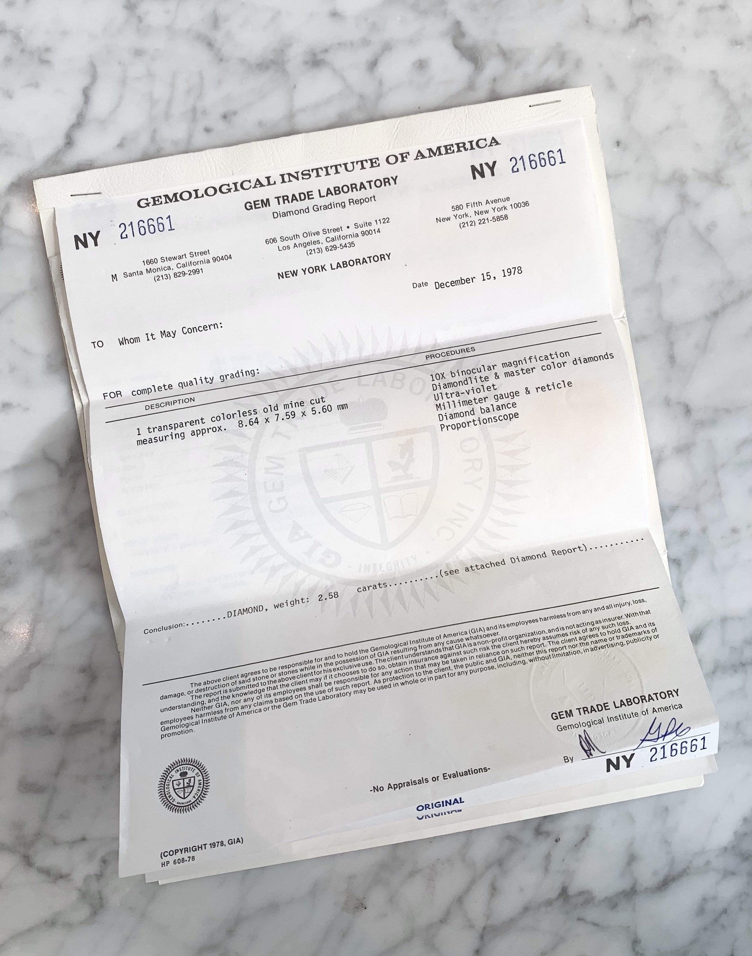 The Annice ring is an authentic vintage engagement ring from the Art Deco Era circa 1920. The ring centers a GIA certified 2.58-carat old mine cut diamond of D color, VS1 clarity. The stone is set in a platinum setting with 2 carré cut diamonds channel-set to either side of the center stone and 20 old European cut diamonds are bead-set into the setting and the filigree of the ring. The side diamonds all combine for approximately 0.60 carats. The ring is currently size 7 and can be resized!
