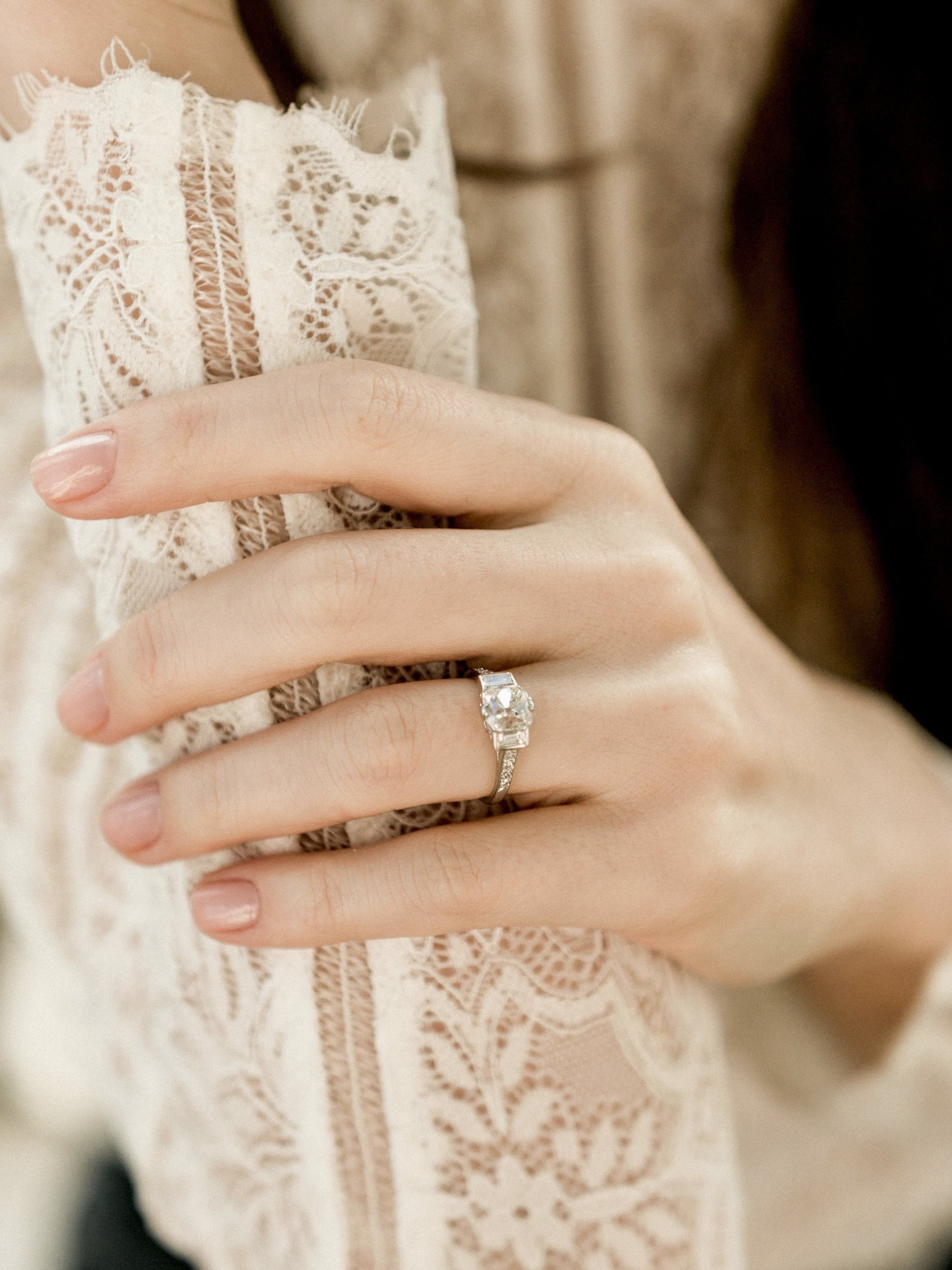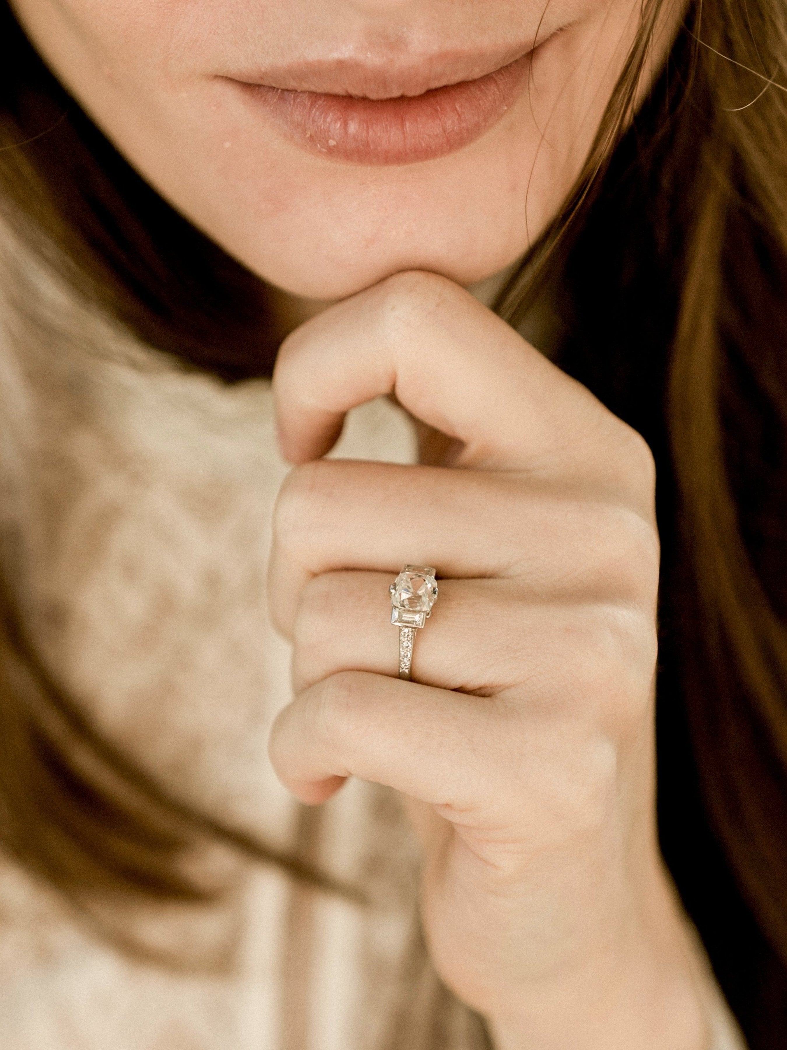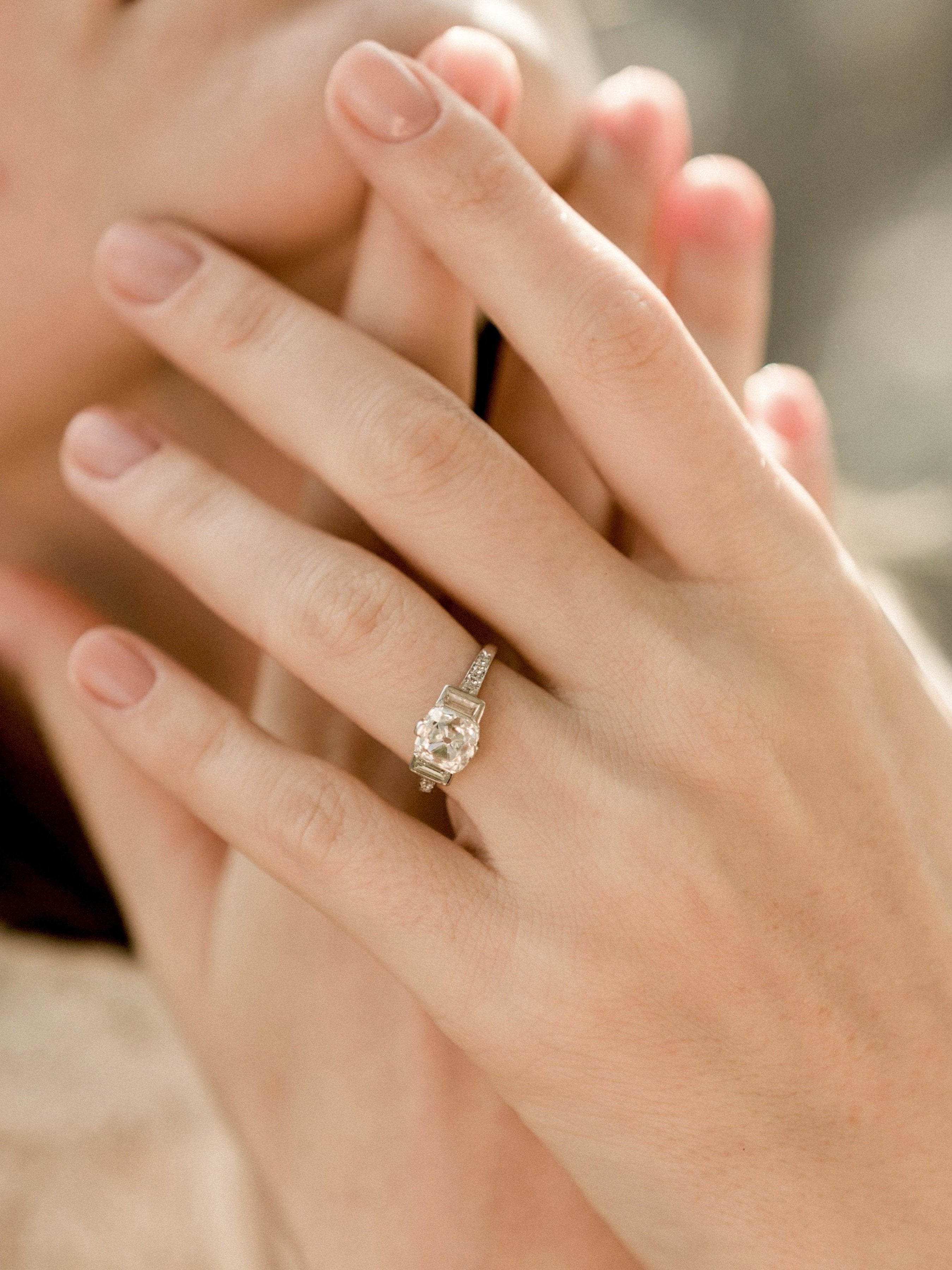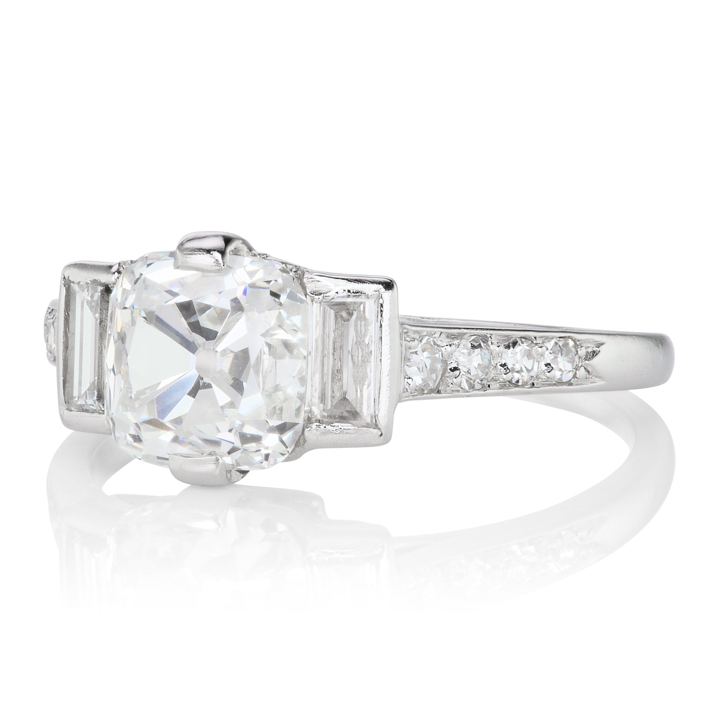 The Beatrix Ring is an authentic Art Deco engagement ring circa 1925 signed Cartier. This vintage Cartier diamond engagement ring centers a GIA Certified 1.72ct Old Mine Cut diamond of I color, VS1 clarity. The stone is set in a sleek platinum setting and is decorated to each side by a sleek, vertically-set baguette with 4 small round diamonds set into the shank. The ring is size 5.5 and can be resized!Why We Love It