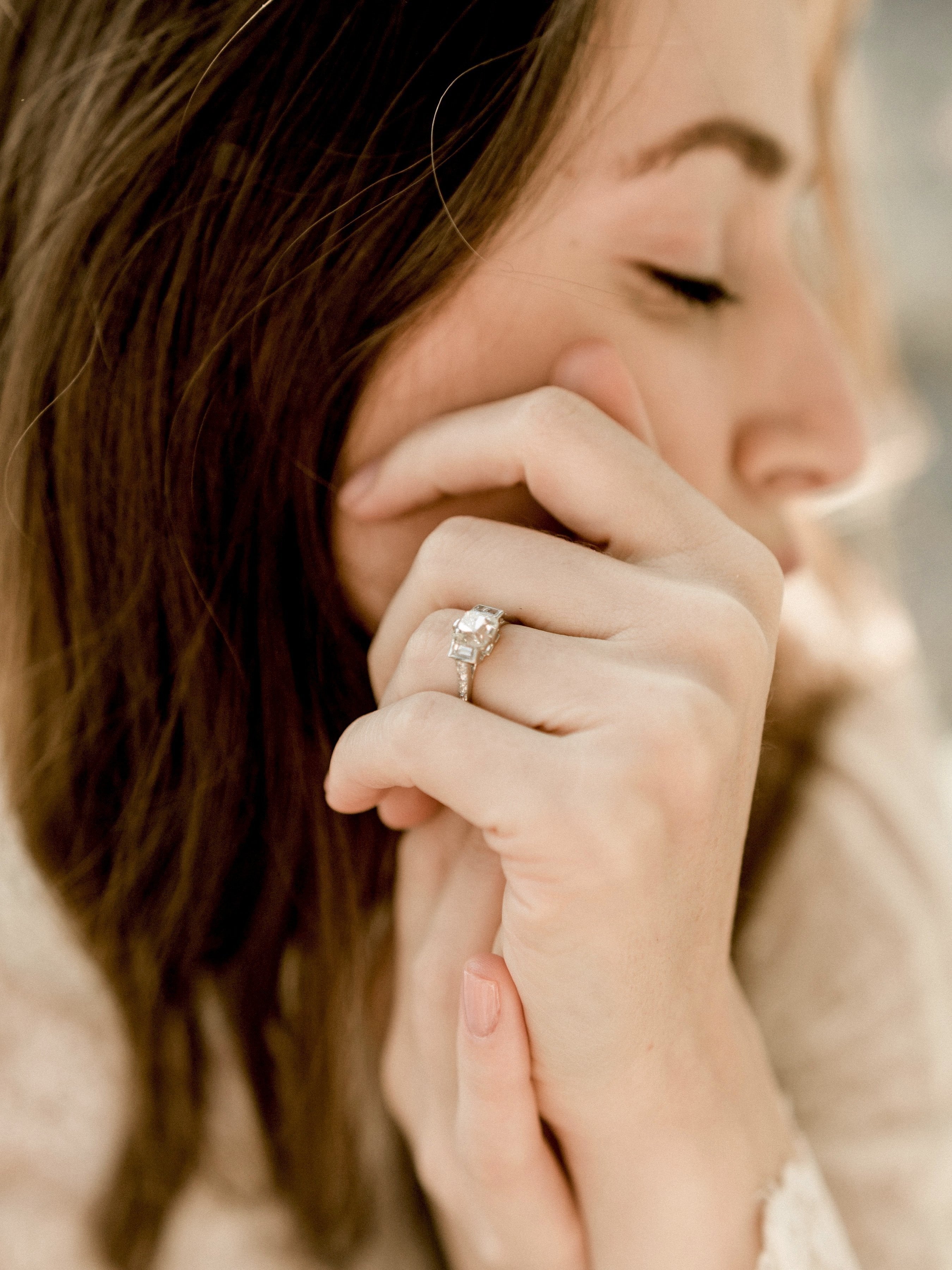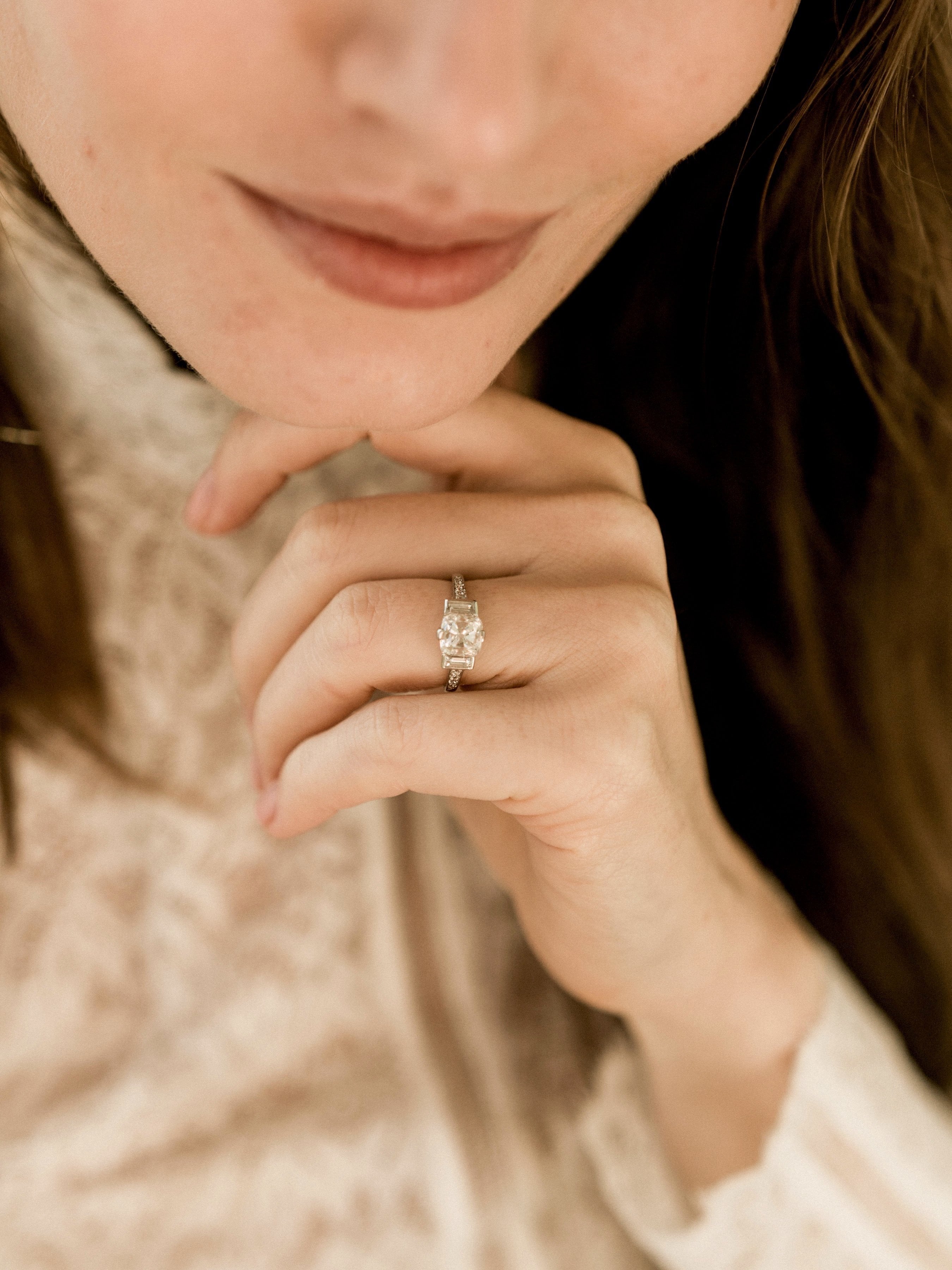 Super sleek and chic with icy white stones! The ring is delicate and low-profile while still having some of that Art Deco edge!