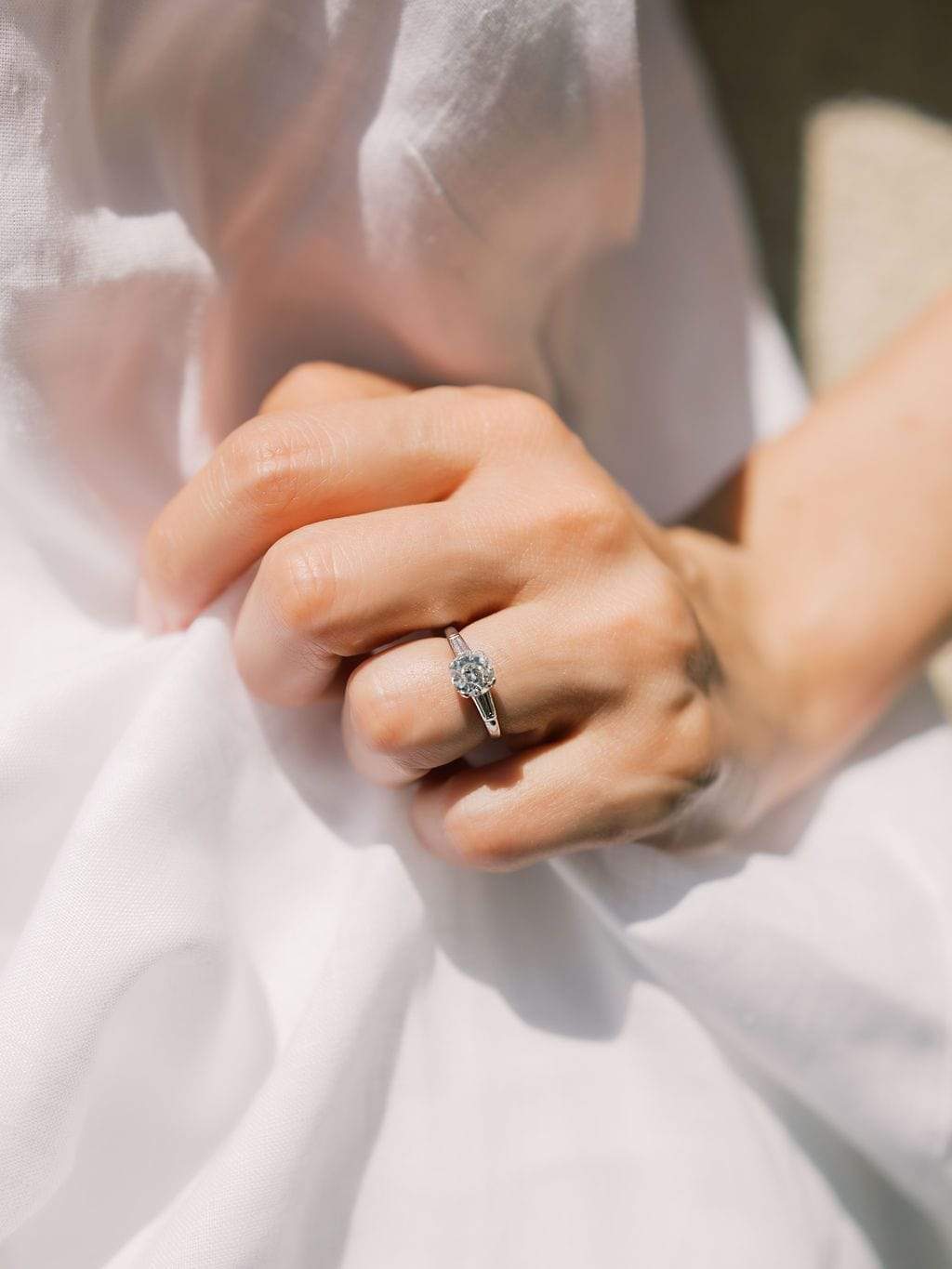 The Elon ring is an authentic vintage Cartier engagement ring from the Retro era circa 1950! The ring centers a GIA certified 1.04 carat old European cut diamond of F color, VS1 clarity. The diamond is set in a classic 4 prong setting with a tapered baguette of approximately F-G color, VS clarity to each side. The inside of the ring has the engraving "J.D.L. to J.H.B. 12-27-50". The ring is currently size 4.5 and can be resized!