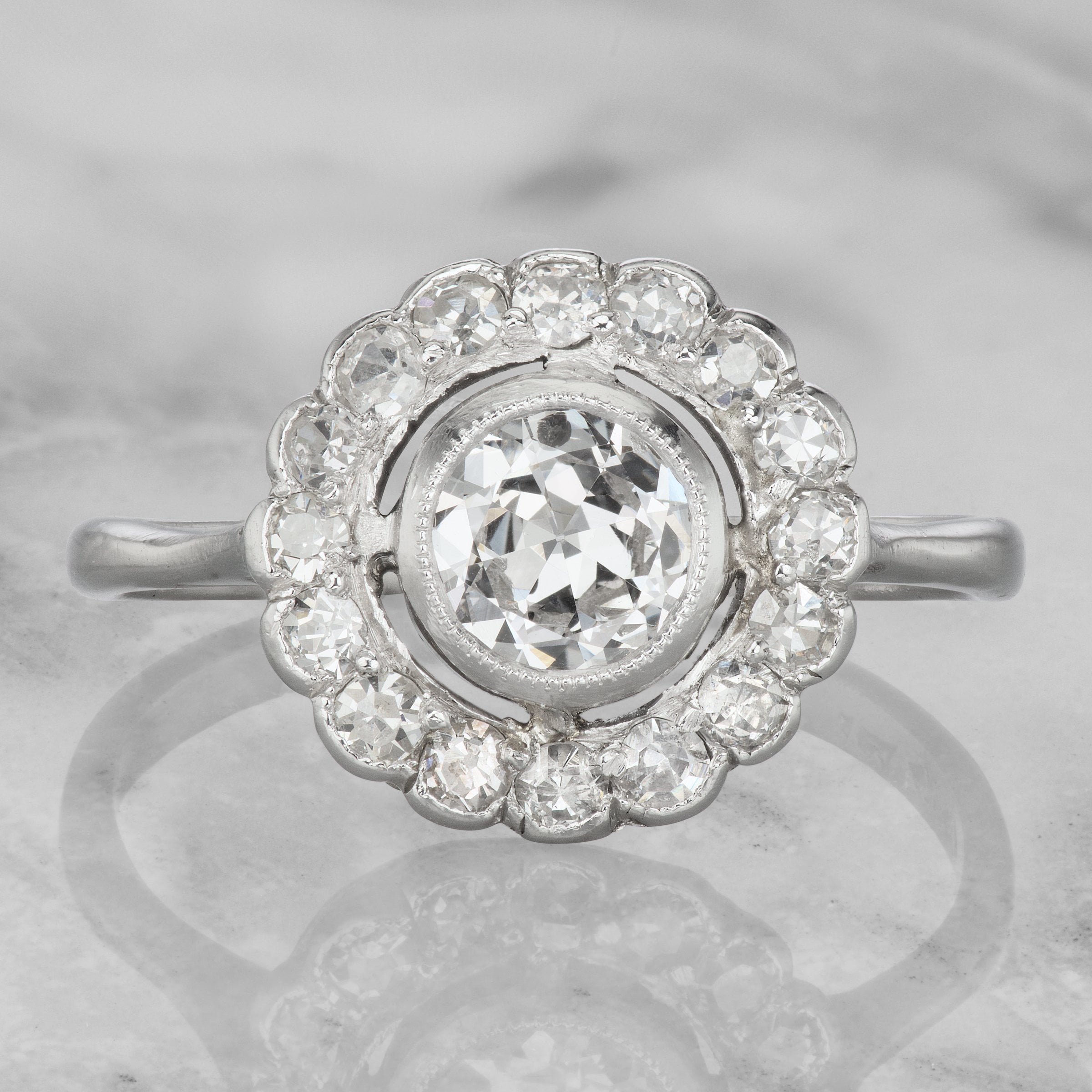 The Hailey ring is a vintage cluster style engagement ring from the Edwardian Era, circa 1915! The ring centers an old European cut diamond of approximately 0.50 carats, H-I color, I1 clarity. The diamond is bezel-set in platinum with a halo of 16 old European cut diamonds that combine for approximately 0.20 carats. The platinum band tapers towards the cluster. The ring is size 5 and can be resized!