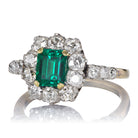 The Delacroix ring is an authentic vintage diamond ring from the Art Deco Era circa 1920. The ring centers a GIA-certified 1.00 carat Octagonal Step Cut Columbian Emerald with No Enhancement. A halo of 10 Old Mine Cut diamonds totaling 0.60 carats surround the emerald. The stones are prong set in a two-tone 18kt yellow gold and platinum setting. The ring is currently size 6.75 and can be resized!