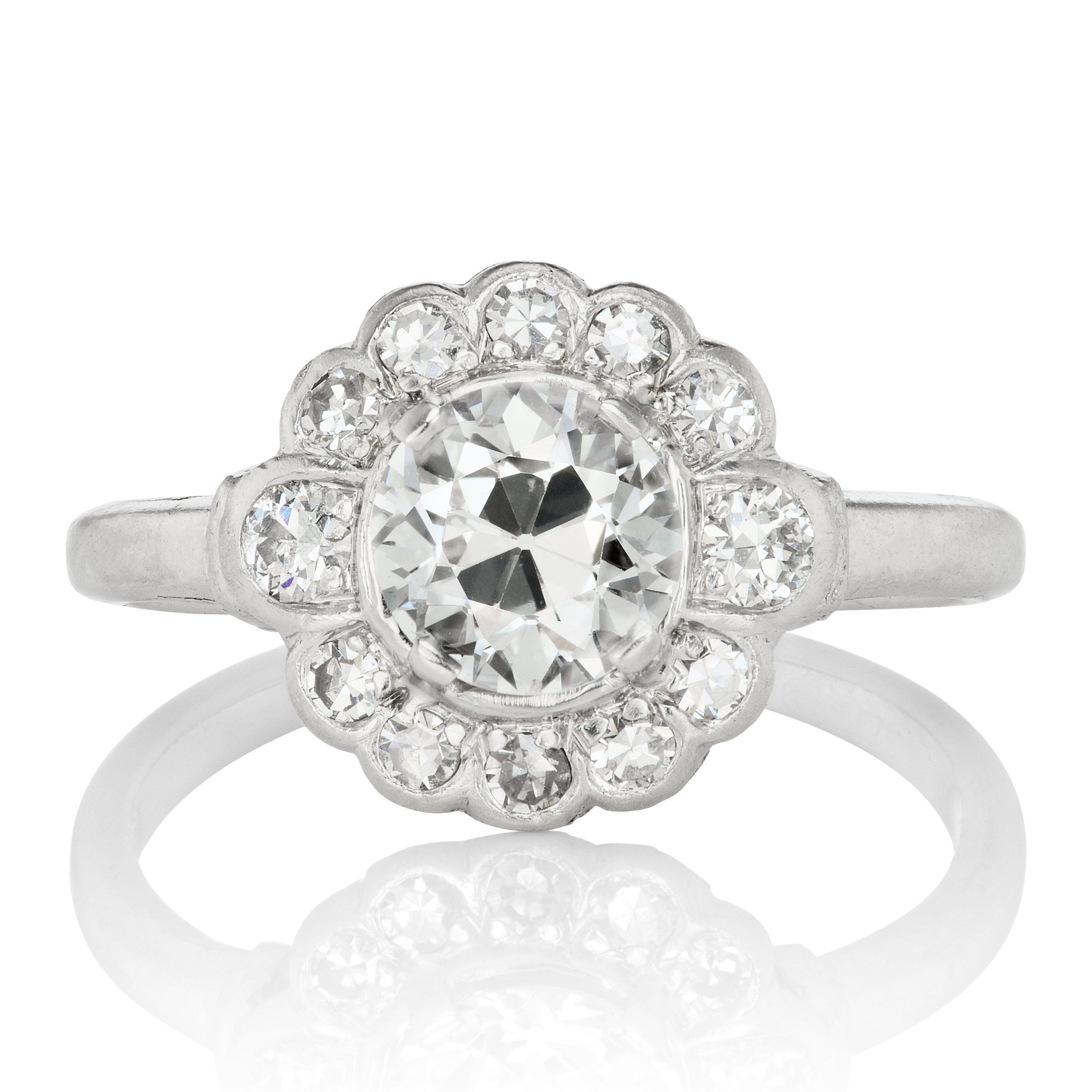 The Jeanne ring is an Edwardian cluster engagement ring circa 1910! The ring centers a 0.85 carat old European cut diamond of approximately J-K color, SI1 clarity. The diamond is set in a 4 prong platinum setting. A halo of 12 old cut diamonds surrounds the center diamond combining for approximately 0.30 carats. The ring is size 5 and can be resized!