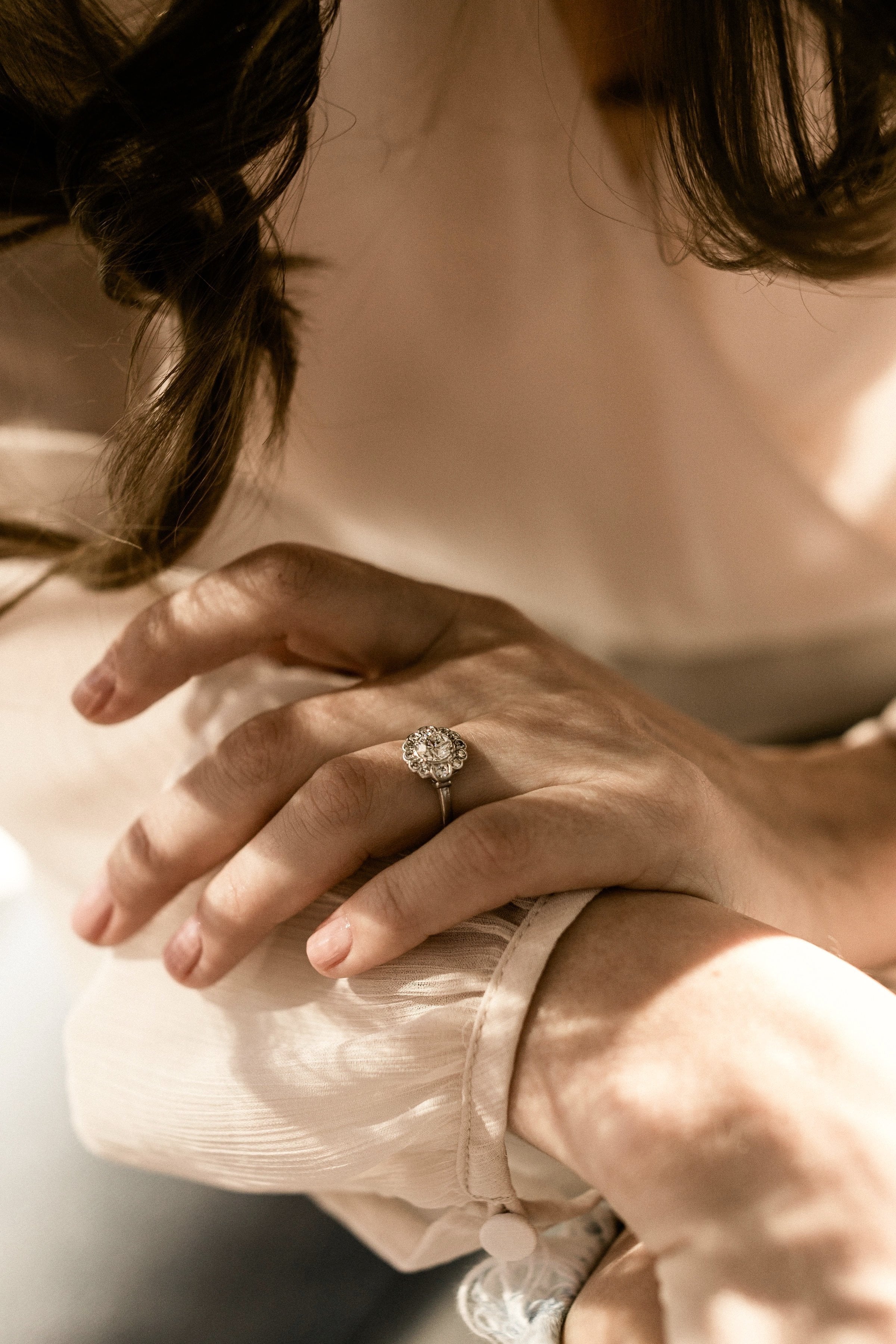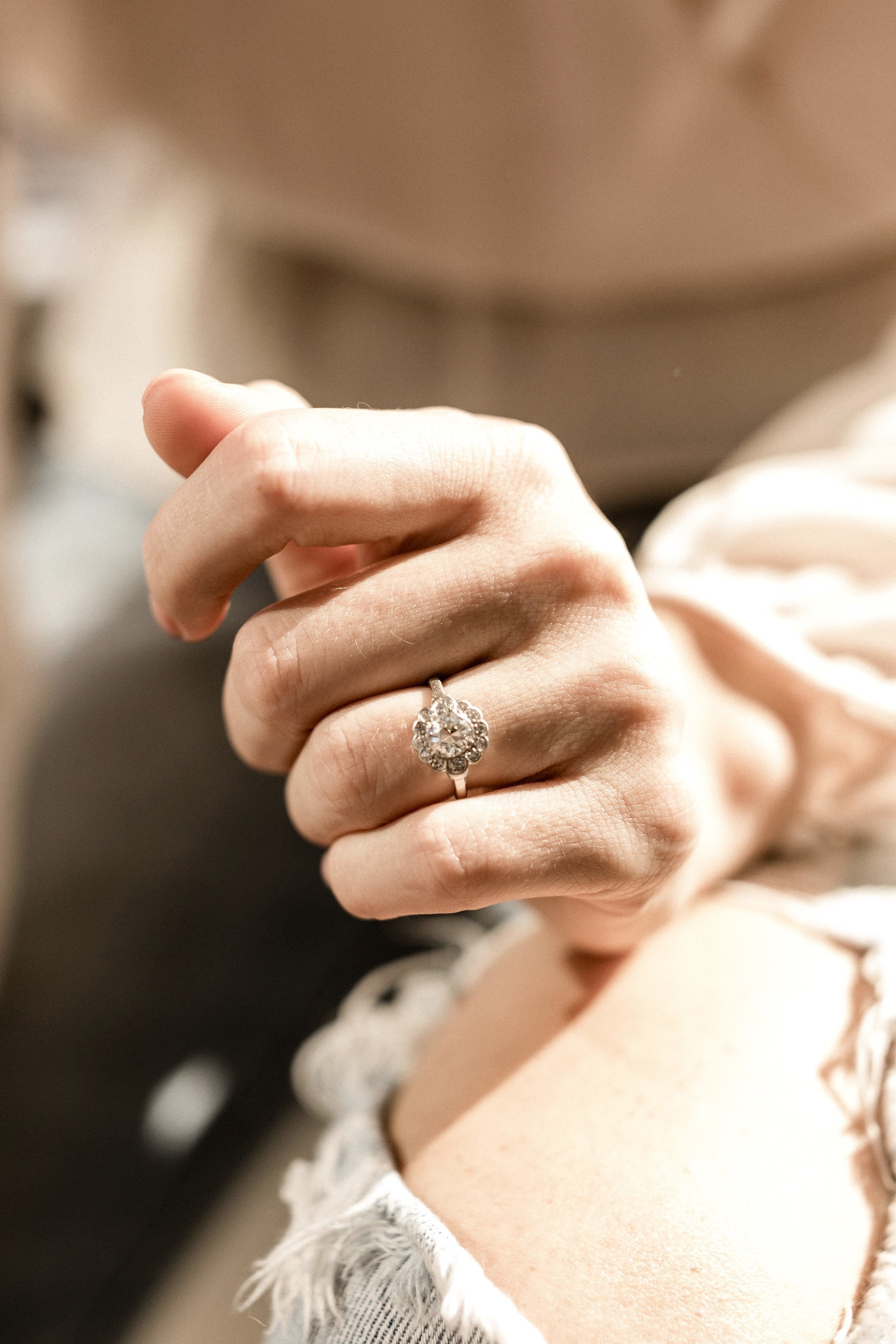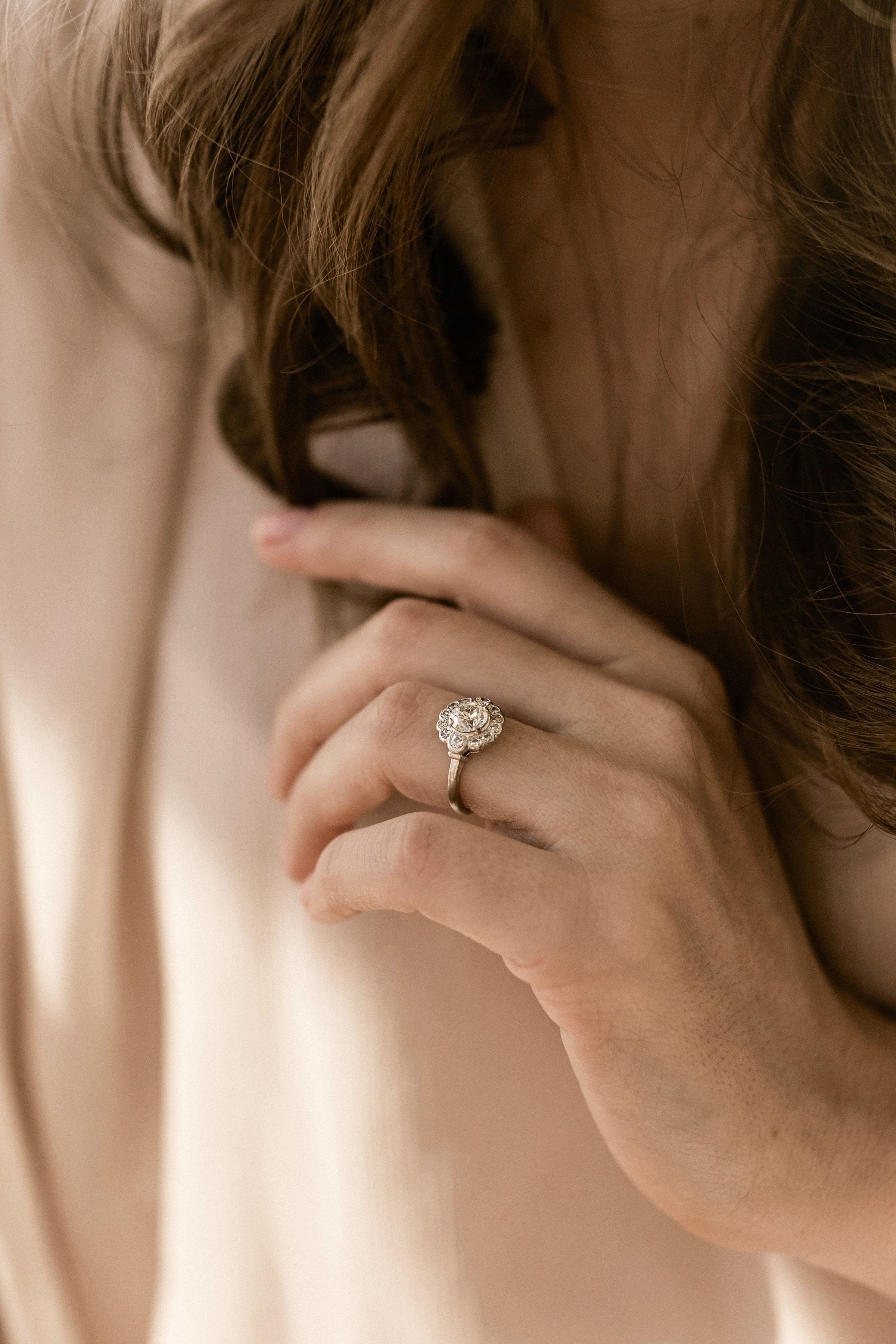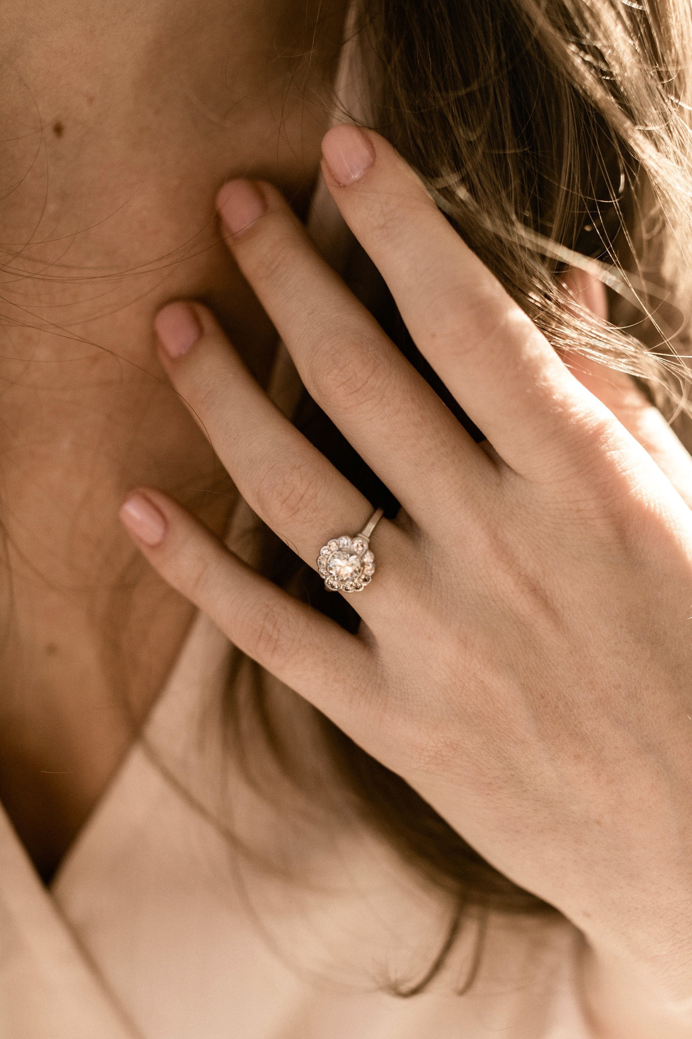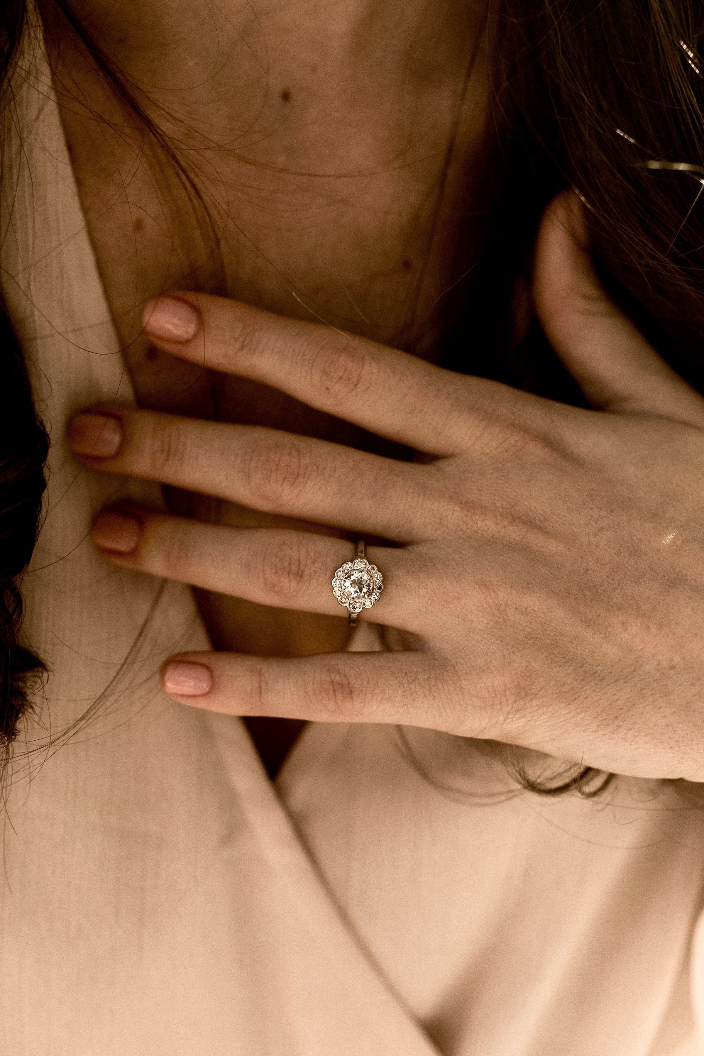 A lovely Edwardian cluster with a super low profile and lots of shine! Effortlessly feminine and romantic with the florally inspired design!