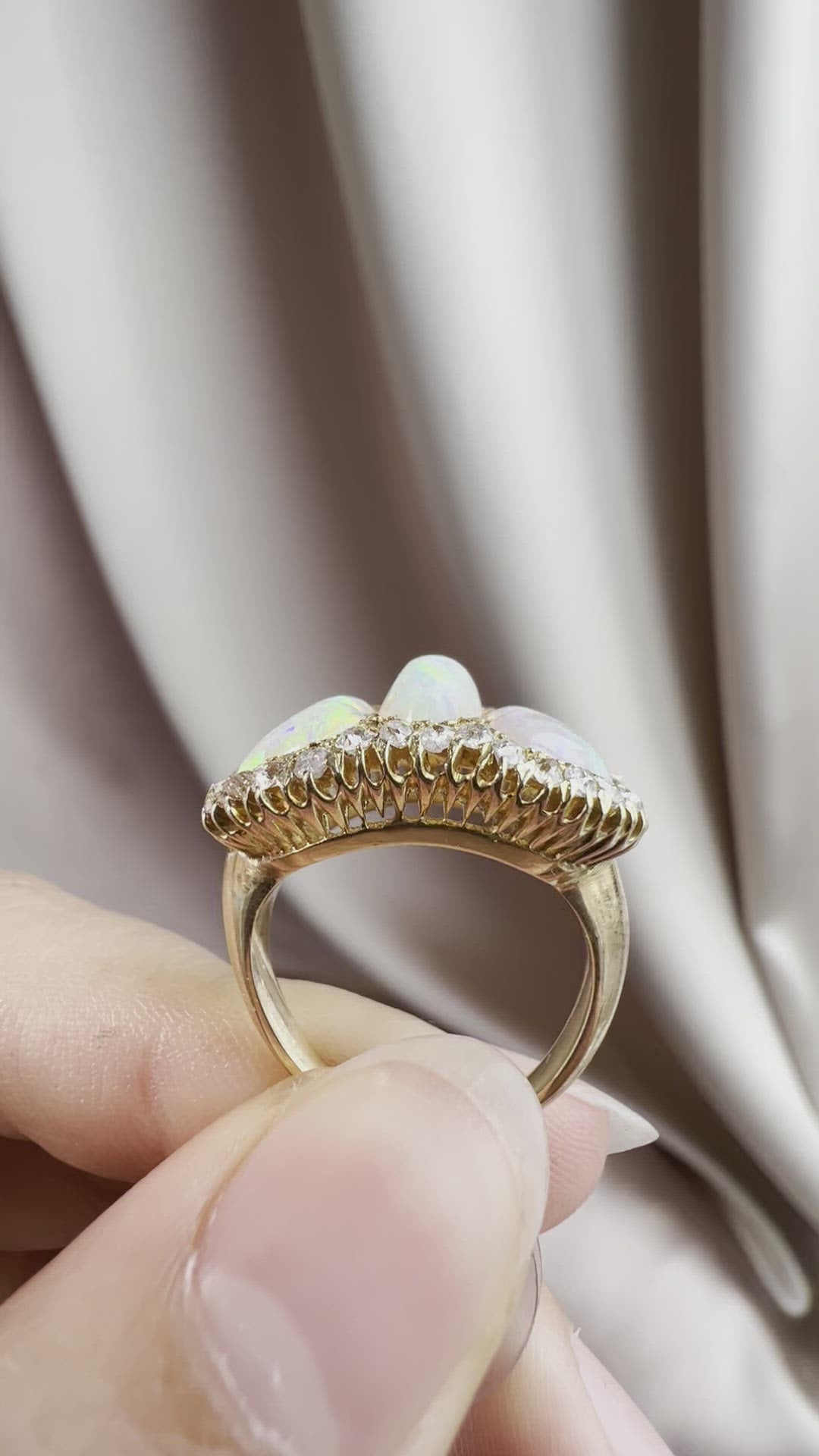 The Dominique ring is an authentic vintage opal and diamond cluster cocktail ring from the Edwardian Era circa 1900. The ring features one oval and two heart-shaped opals surrounded by a halo of old cut diamonds. The stones are set in an 14kt yellow gold setting with a superbly detailed basket! The ring is currently size 5 and can be resized!