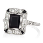 The Rebel Ring is a French-made vintage onyx stone engagement ring from the Art Deco Era, circa 1920! The ring centers a rectangular shaped black onyx of approximately 1.30 carats that is bezel-set in a platinum setting. A sleek halo of 14 french cut diamonds surround the center stone with black onyx accenting each corner. An additional 3 French cut diamonds line each shoulder. The face of the ring measures 13mm by 11.5mm. The ring is size 4.75 and can be resized!