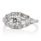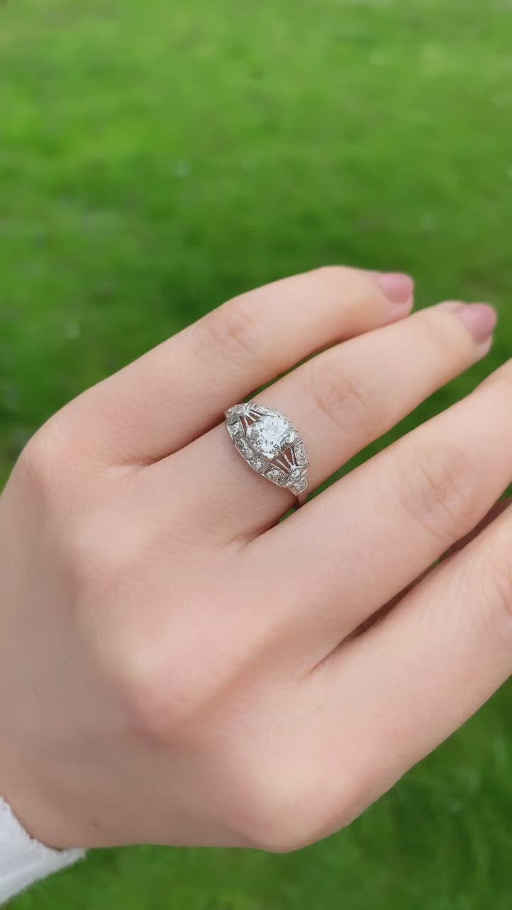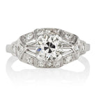 The James ring is an authentic vintage diamond engagement ring from the Art Deco era. The ring centers a GIA certified 0.97-carat old European cut diamond of H color, SI1 clarity. The stone is set in a 4-prong platinum setting with gorgeous open metalwork details and an additional 14 diamonds set throughout. The ring is currently size 6.5 and can be resized!