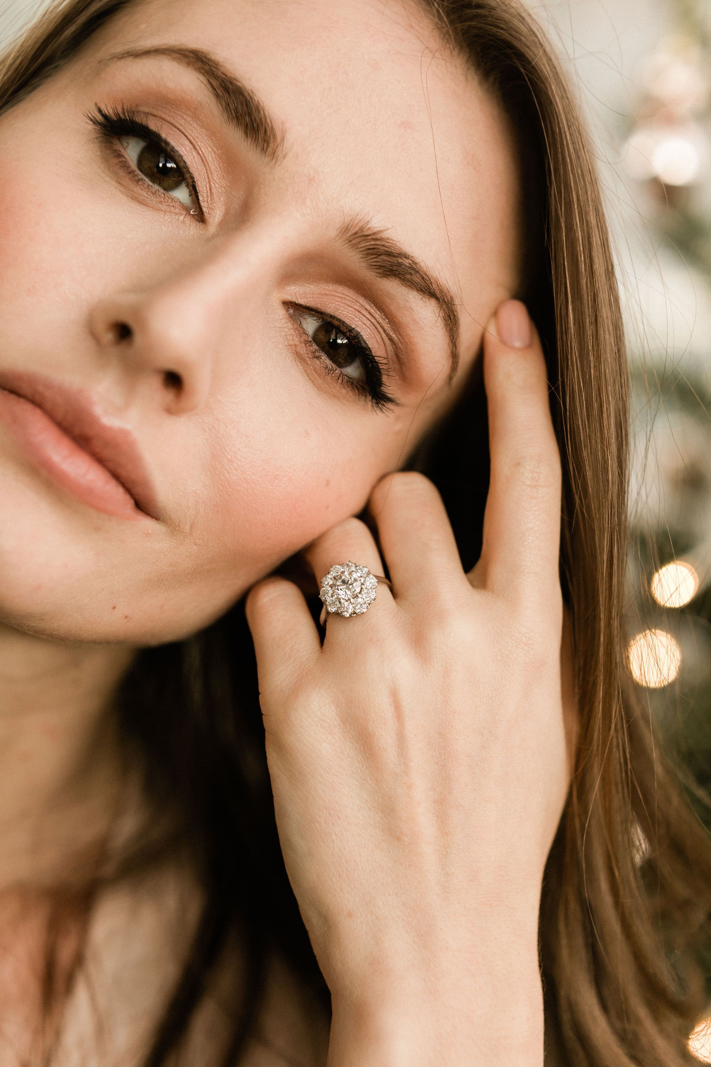 This cluster has such a vibrant and big look! Super glam which very white and beautiful diamonds that are set oh, so low!