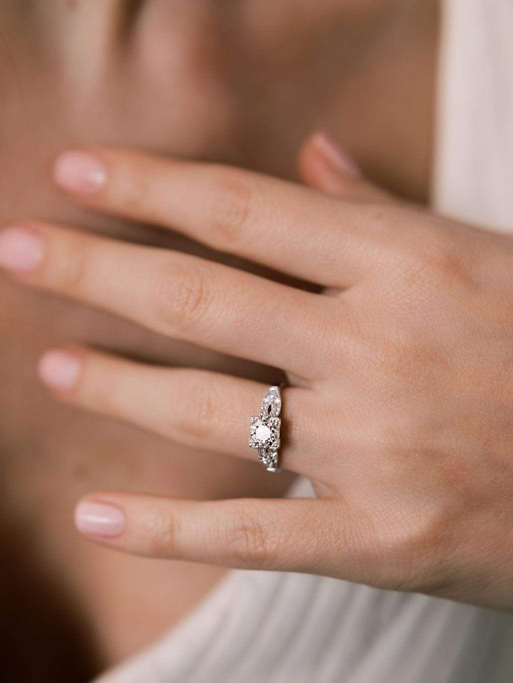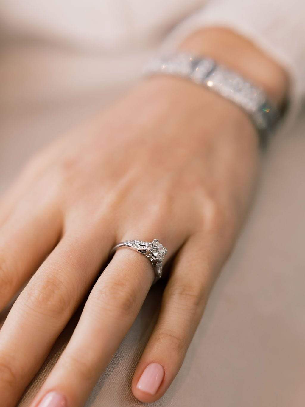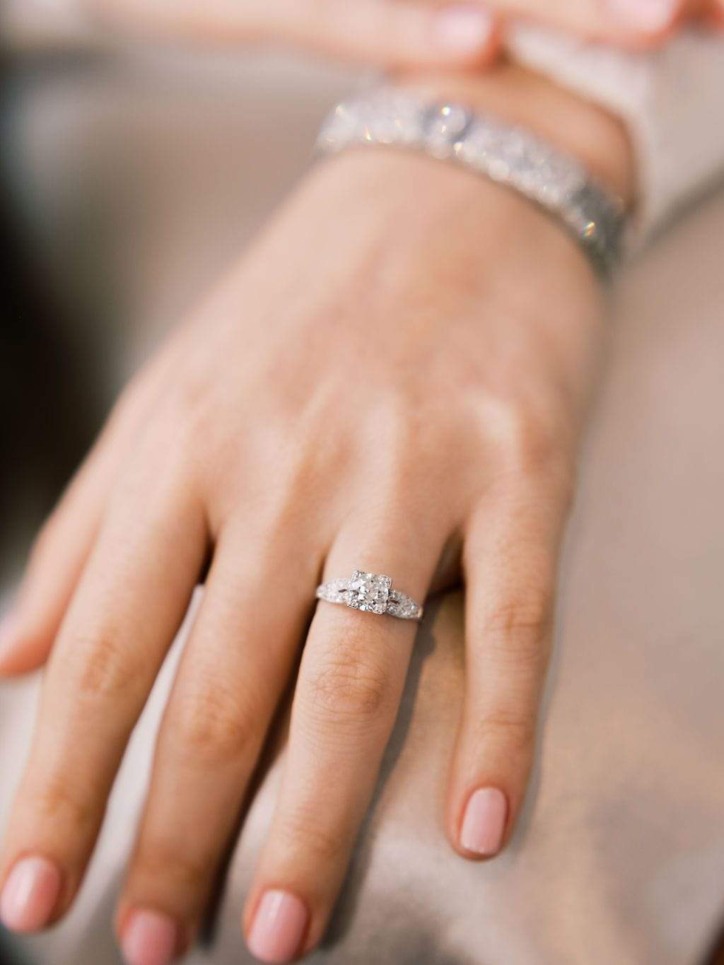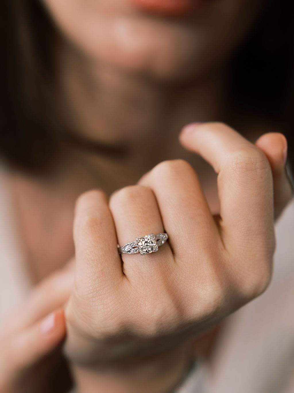 The diamond in this ring is so beautiful! Very white and with lovely faceting that is complemented by flowing, glittering shoulders!