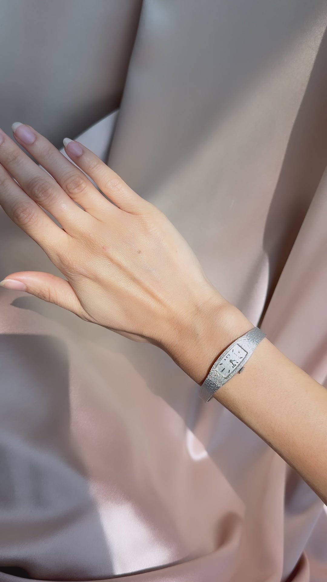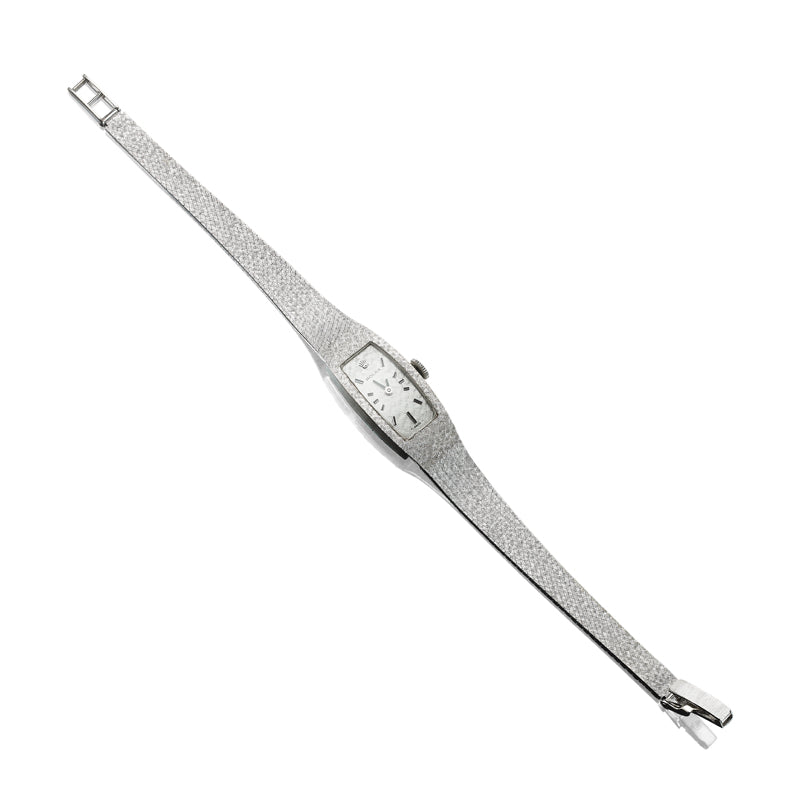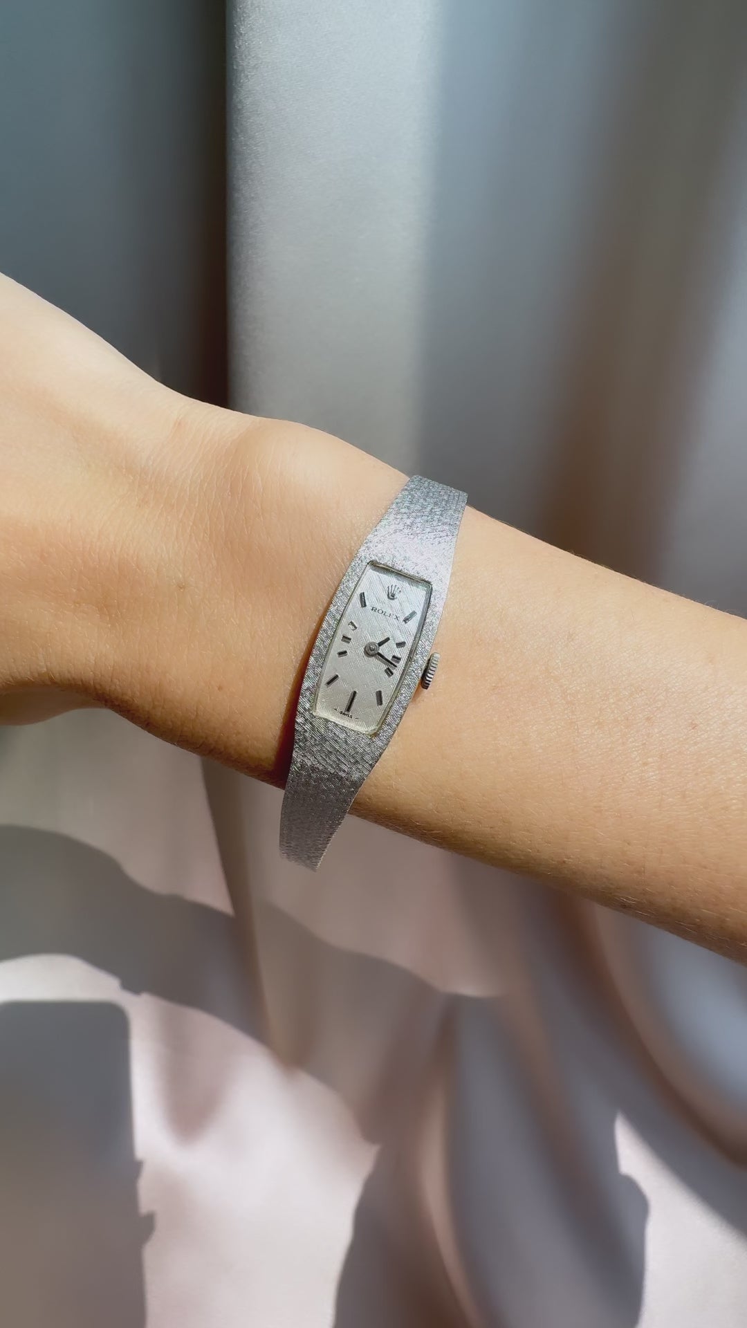 The Chen watch is an authentic vintage Swiss Rolex watch from the 1970s/1980s. The watch is made of 14kt white gold. The inside face is approximately 19 mm in length and 9.4 mm in width. The total length of the watch is 7 inches and cannot be resized. The watch is in working condition and needs to be wound daily to tell accurate time!