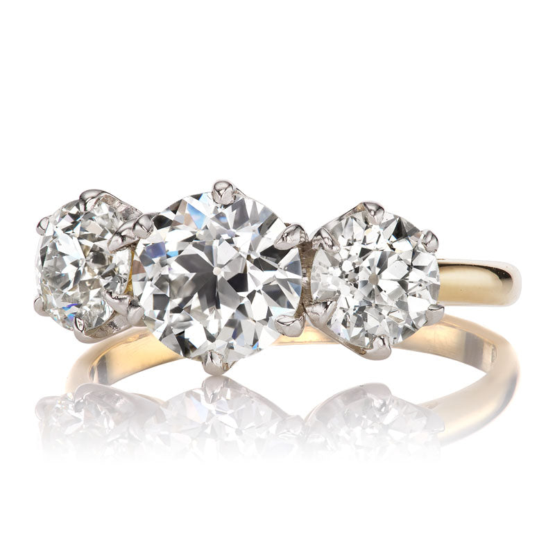 The Martina ring is a vintage diamond ring from the Art Deco Era circa 1930. The ring centers a GIA-certified 1.59-carat old Old European Cut diamond of K color, SI1 clarity. A GIA-certified 0.74-carat Old European Cut of K color and SI1 clarity, and a GIA-certified 0.82-carat Old European Cut diamond of K color, SI1 clarity are set to either side. The stones are set in a two-tone platinum and 18kt yellow gold setting. The ring is currently size 7.25 and can be resized!